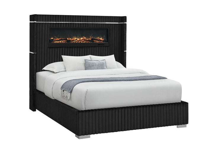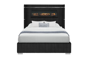 Introducing the 2215 Bed by Global Furniture USA, a masterpiece of comfort and modern design with a twist of luxury. This fully upholstered bed, available in both King and Queen sizes, is finished in a sumptuously soft plush velour, offering a soothing touch and an opulent aesthetic. The headboard, accentuated with sleek chrome detailing, houses a magnificent LED fireplace, delivering a warm ambiance and a mesmerizing visual effect. This innovative feature not only enhances your room's coziness but also adds an element of sophistication, creating a unique focal point. The 2215 Bed is not just a piece of furniture, but a statement of style and comfort, integrating functionality and design. Experience an unparalleled level of luxury and relaxation with this exquisite creation from Global Furniture USA.
