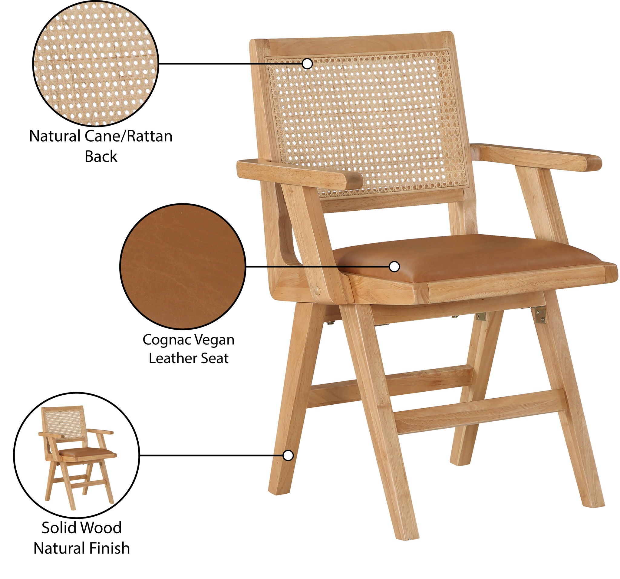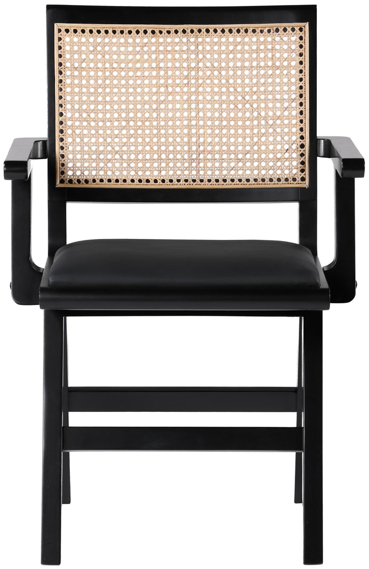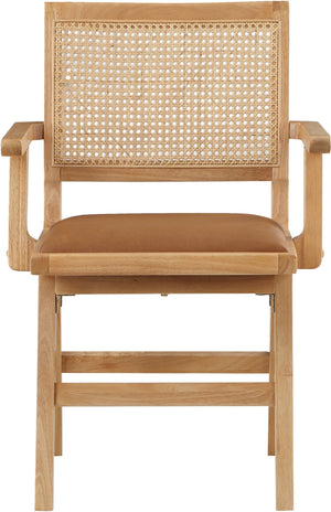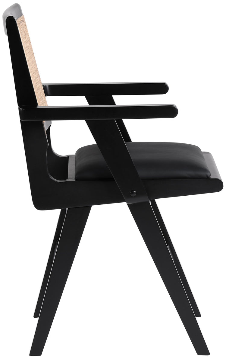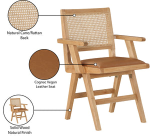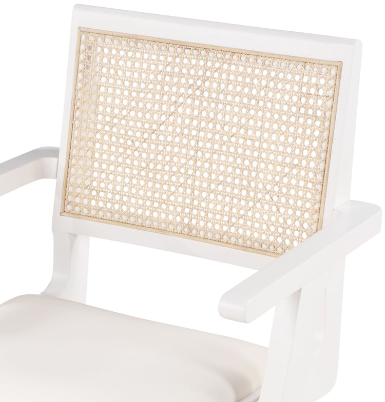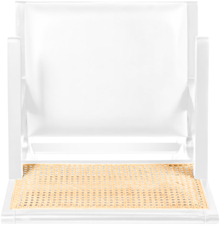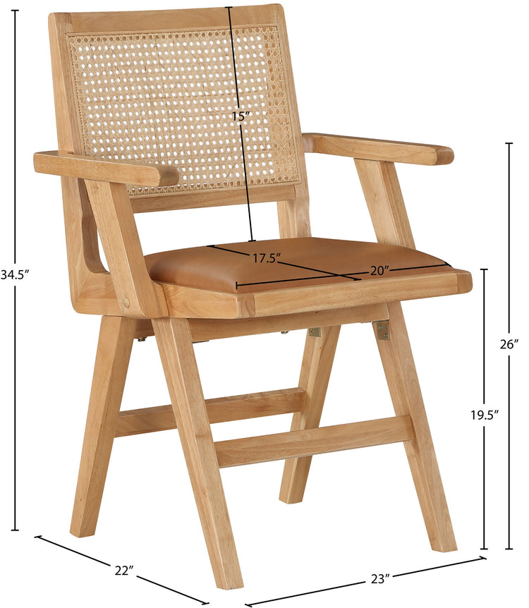 Sit back and relax in this armchair from Meridian Furniture's Abby collection. Featuring a frame crafted from solid wood with a natural finish and a vegan leather seat, this chair is both sturdy and durable so it will last you for years to come. A natural cane backrest seamlessly blends with the chair's natural-finished frame, adding a sense of warmth and charm that ensures it will stand out among all your furniture.