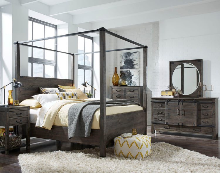 Transitional styling in a welcoming weathered charcoal finish and rustic aged iron hardware create Abington's hospitable allure. In rustic pine solids, this hardworking collection is chock full of unique details, including sliding doors, adjustable shelves, and perfectly proportioned bed canopies. Rustic enough for a loft or retreat, yet sophisticated enough for the uptown industrialist, Abington is an ideal choice.