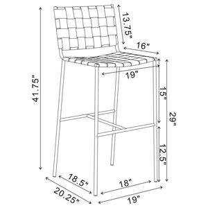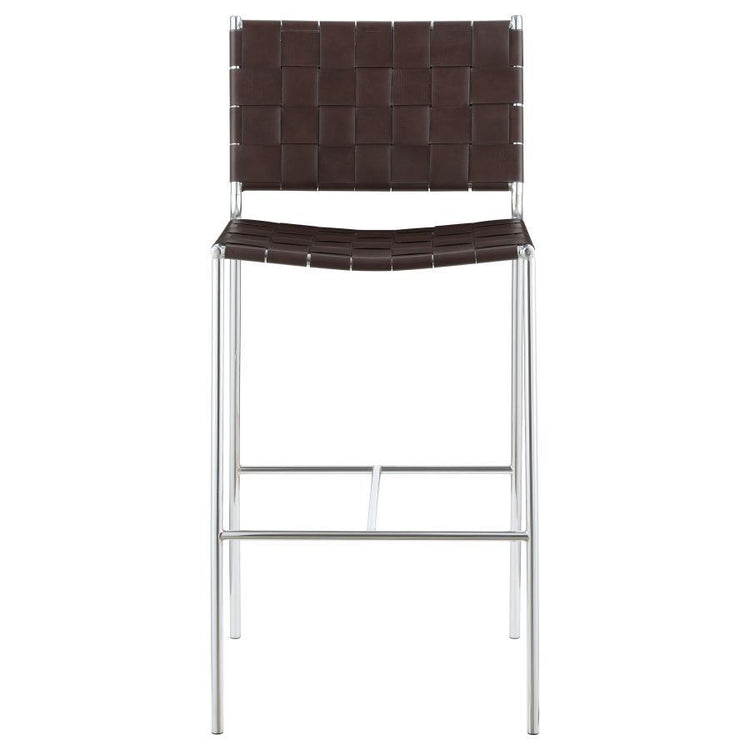 Mid-century elements lead the design aesthetic of this contemporary stool. a slim metal frame in a gleaming chrome finish offers a striking contrast against the brown faux leather accents. narrow leatherette bands weave together to create a backrest and seat, supported by the metal frame. slender legs extend to the floor, connected with an h-shape footrest trestle design. sophisticated and refined, this stool lends itself wonderfully to modern home bars and kitchen counters.