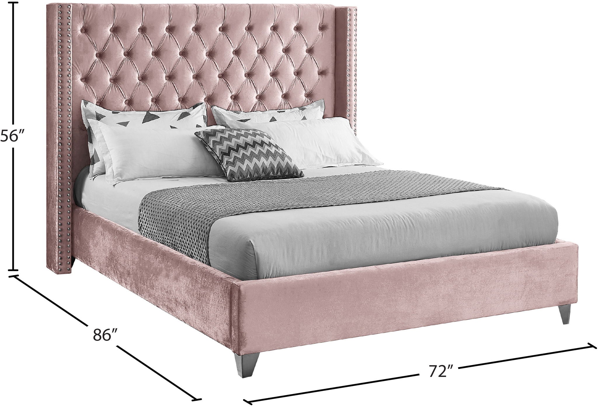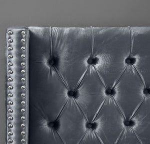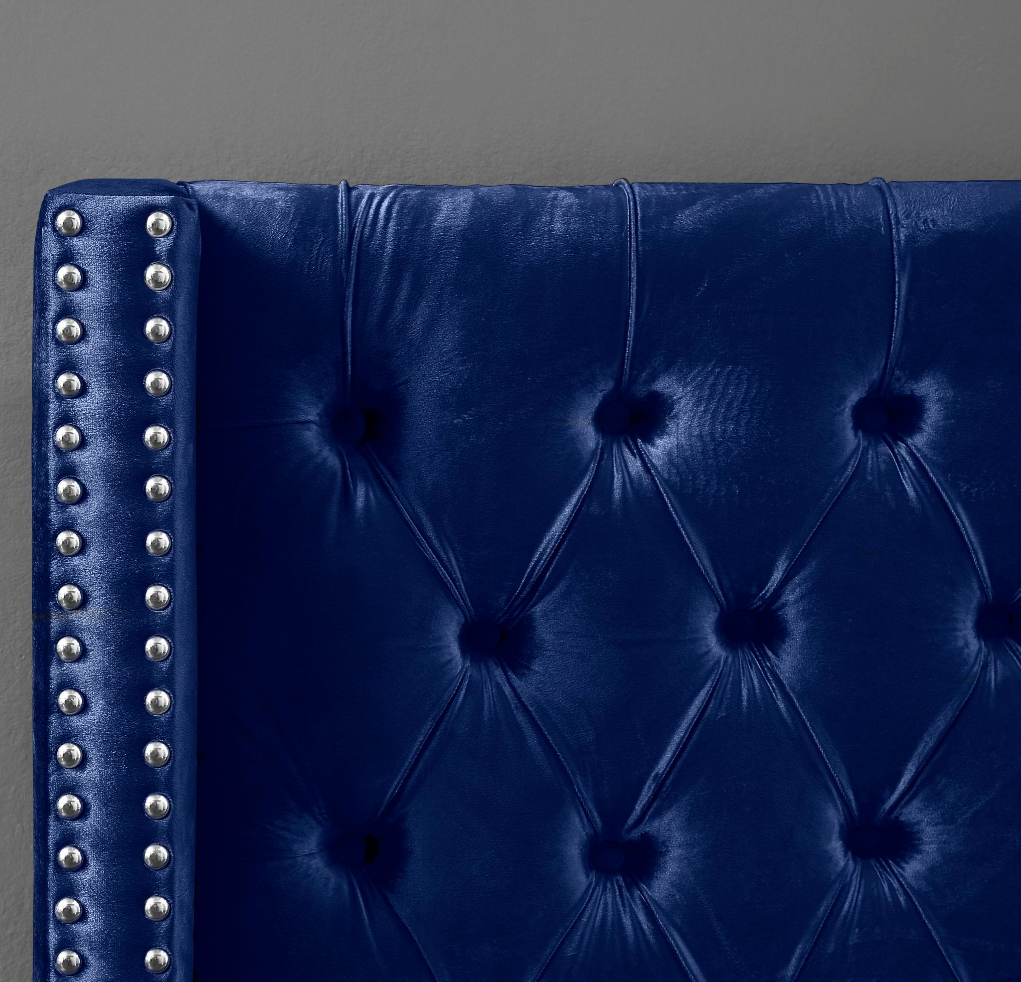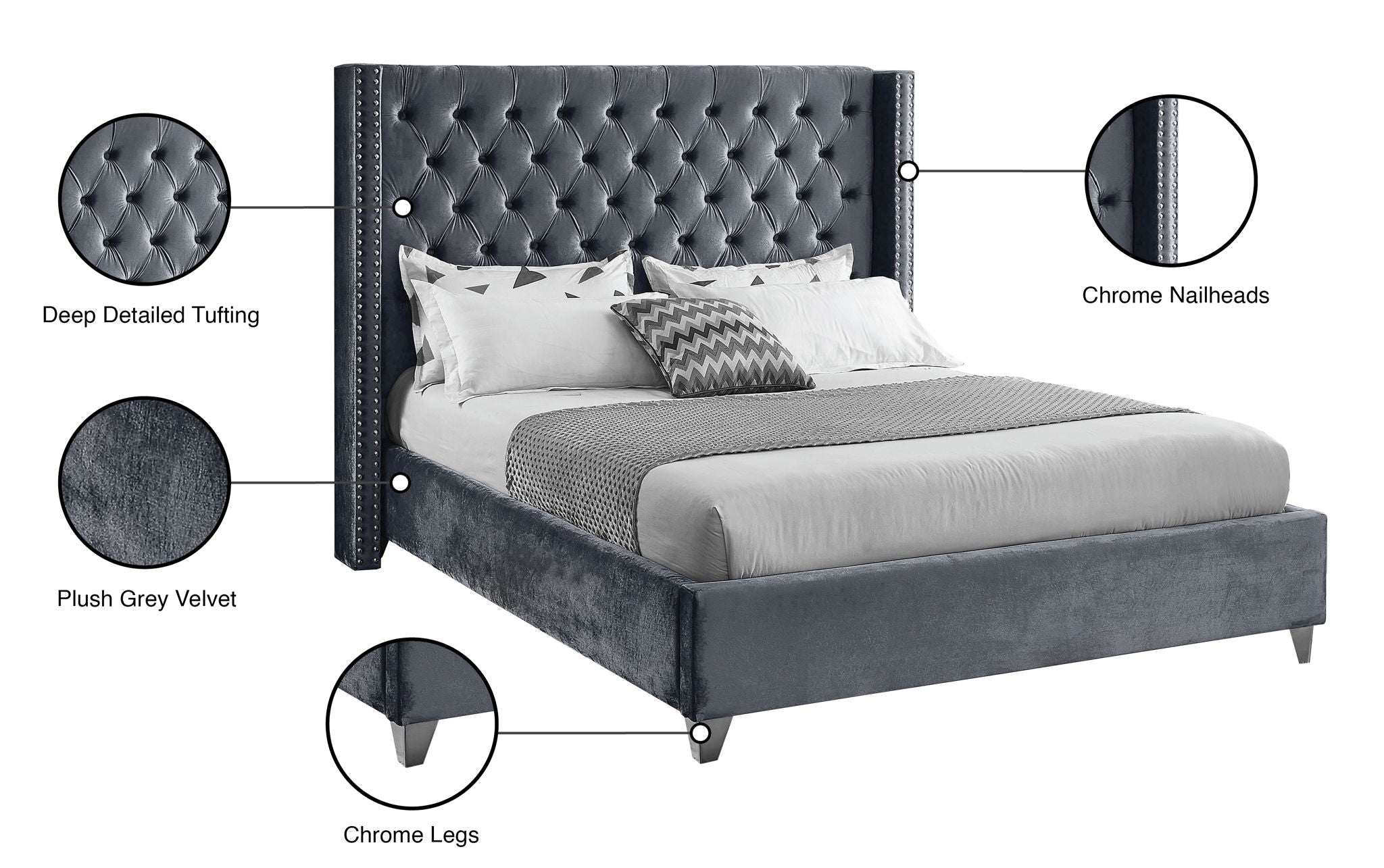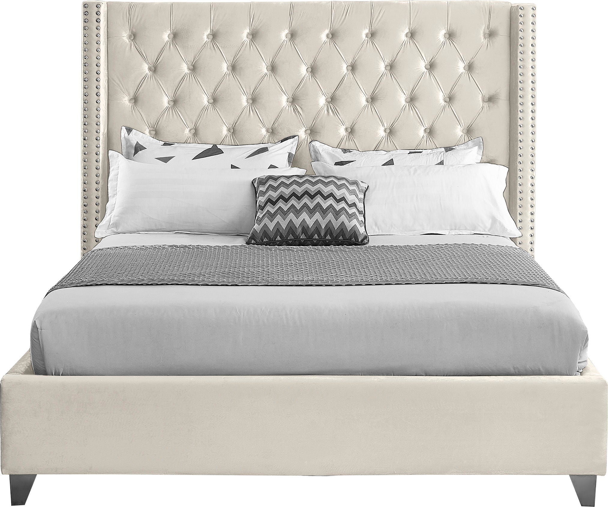 Elegant and eye-catching, the stunning Aiden Bed from Meridian Furniture is the perfect addition to any bedroom. velvet covers the deep tufted design. A beautiful wing bed design is complimented by hand applied nail head details. Strength and beauty is guaranteed with a solid wood frame and stainless steel legs.