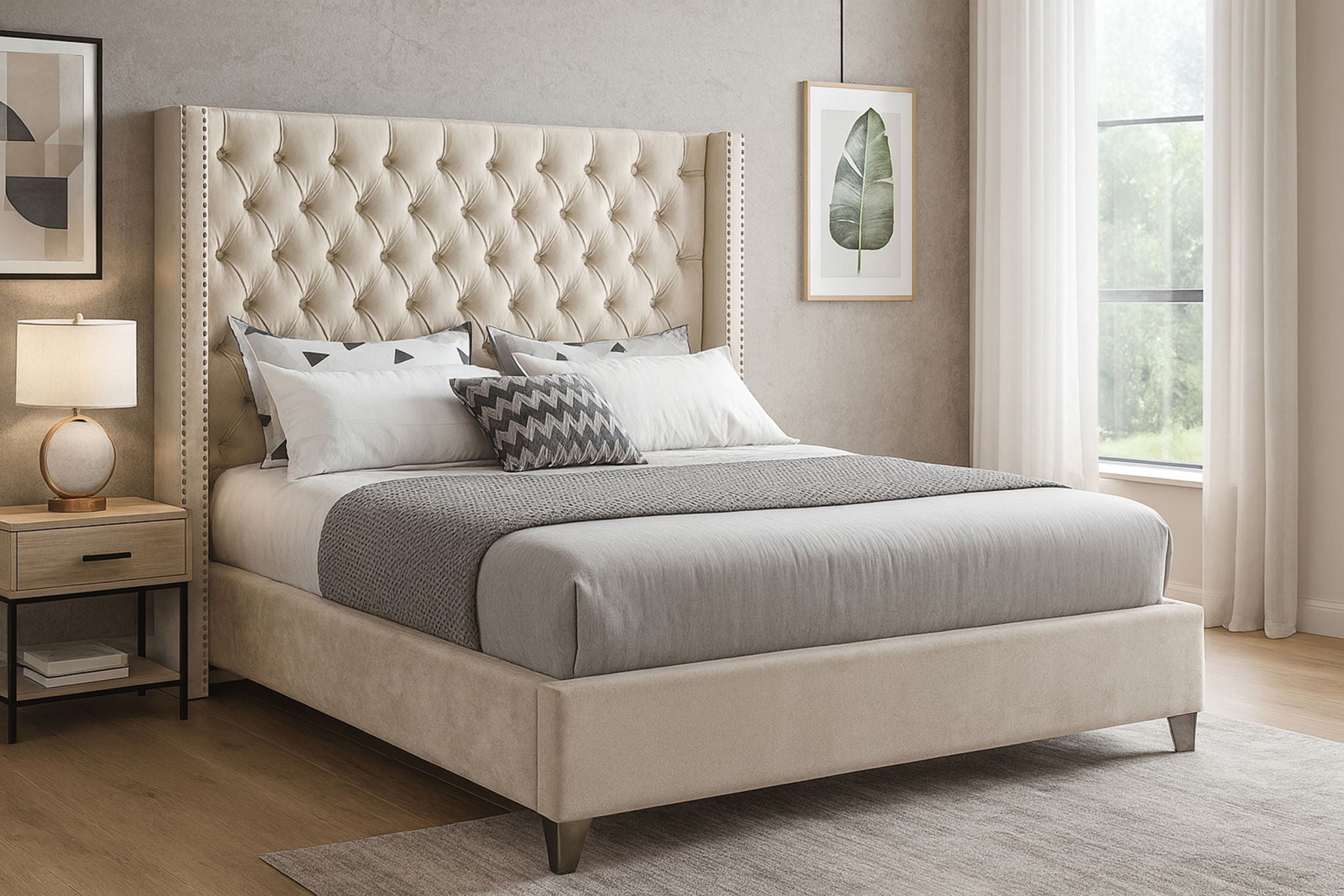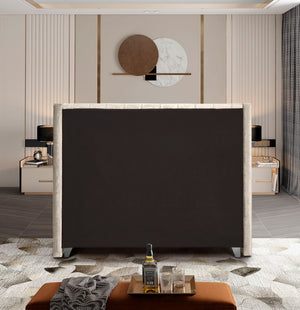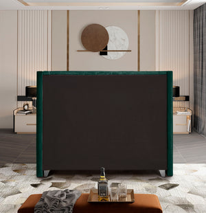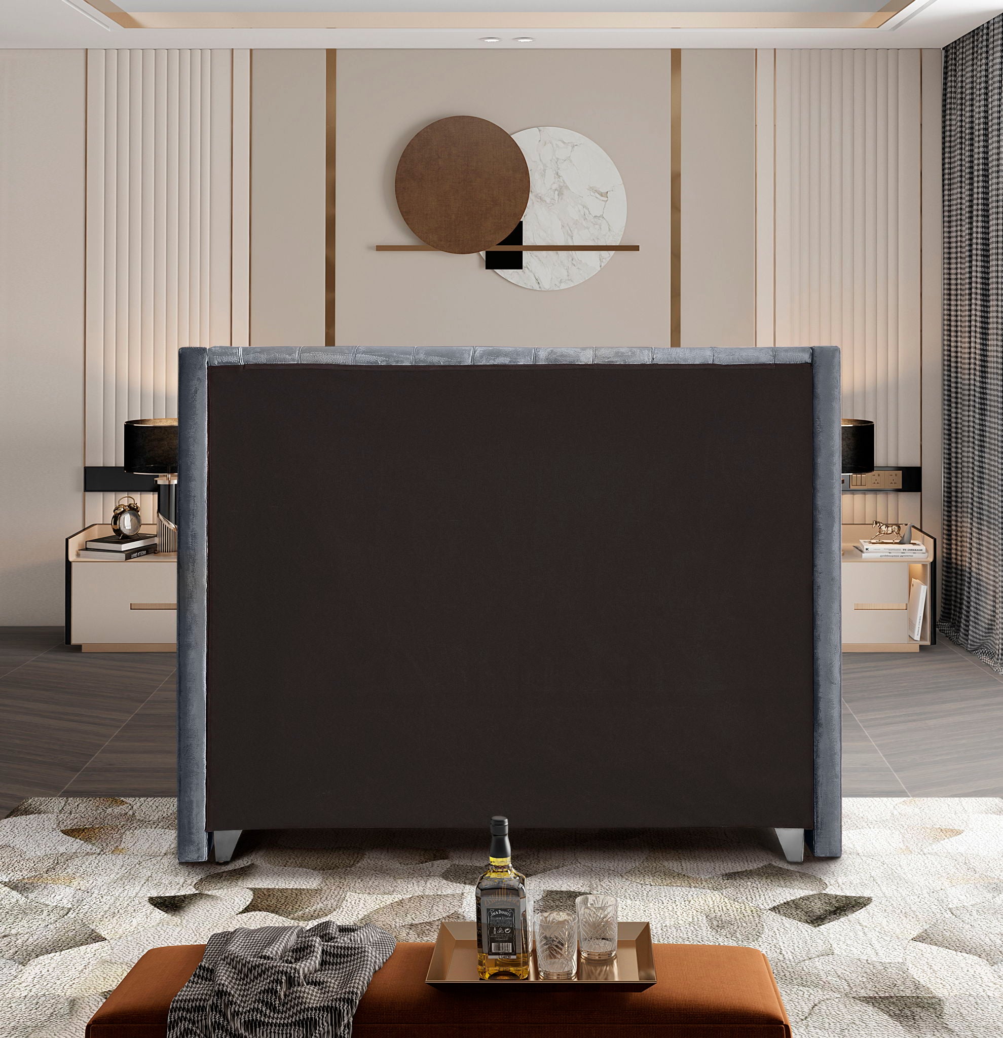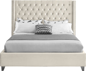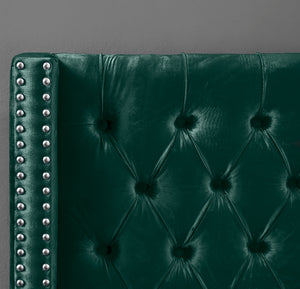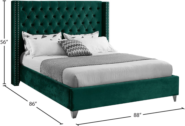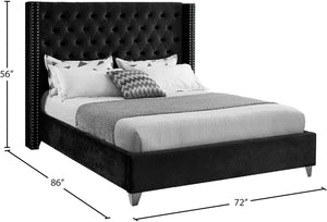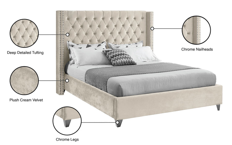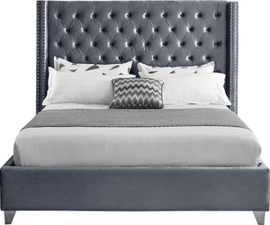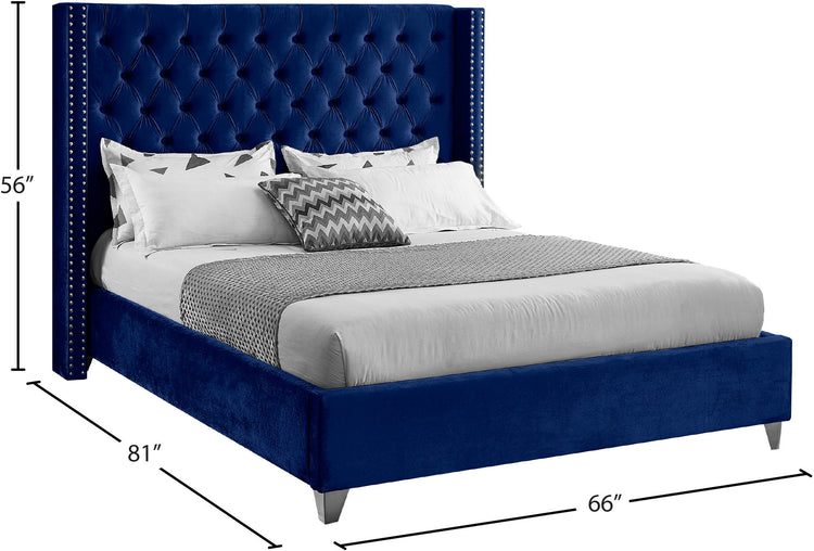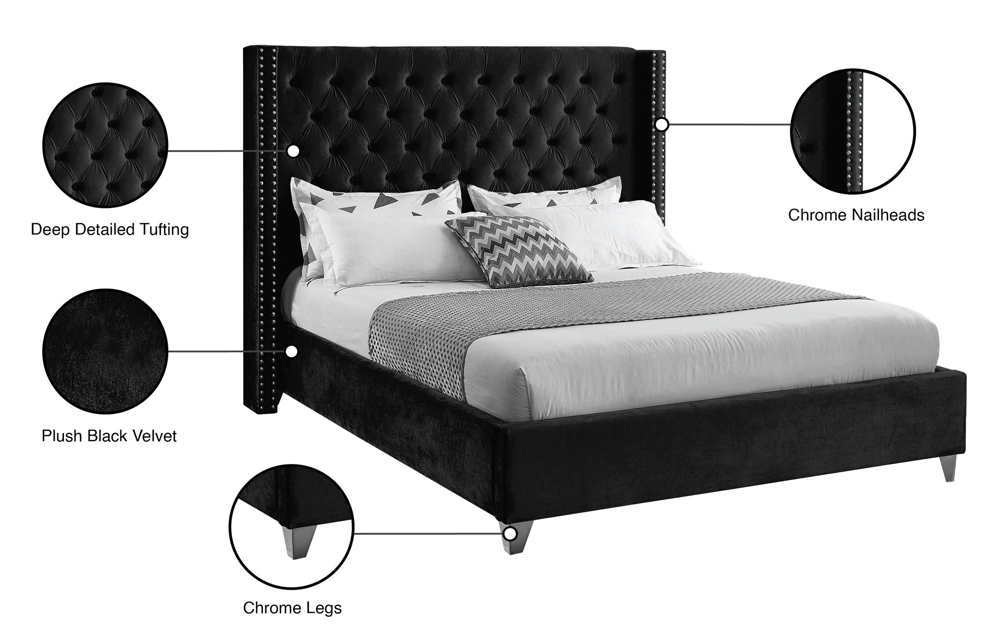 Elegant and eye-catching, the stunning Aiden Bed from Meridian Furniture is the perfect addition to any bedroom. velvet covers the deep tufted design. A beautiful wing bed design is complimented by hand applied nail head details. Strength and beauty is guaranteed with a solid wood frame and stainless steel legs.