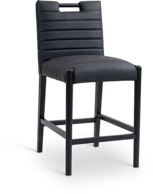 A perfect fusion of modern elegance and eco-friendly luxury is the Aimee vegan leather counter stool. Upholstered in sleek vegan leather, this counter-height stool offers a chic, contemporary look while maintaining a commitment to sustainable living. The padded, quilted design featuring solid black oak wood legs creates a stunning contrast between its soft upholstery and minimalist frame.