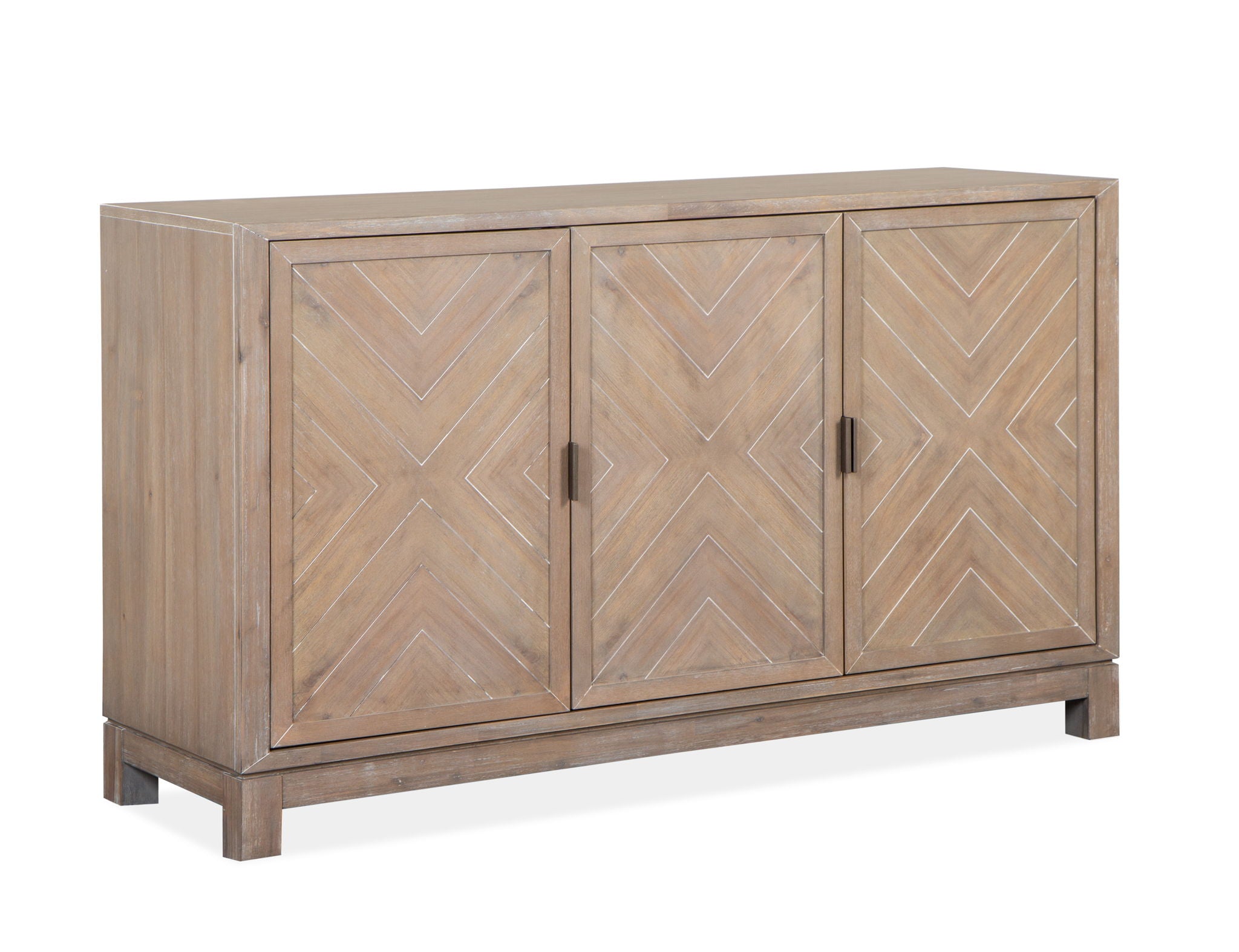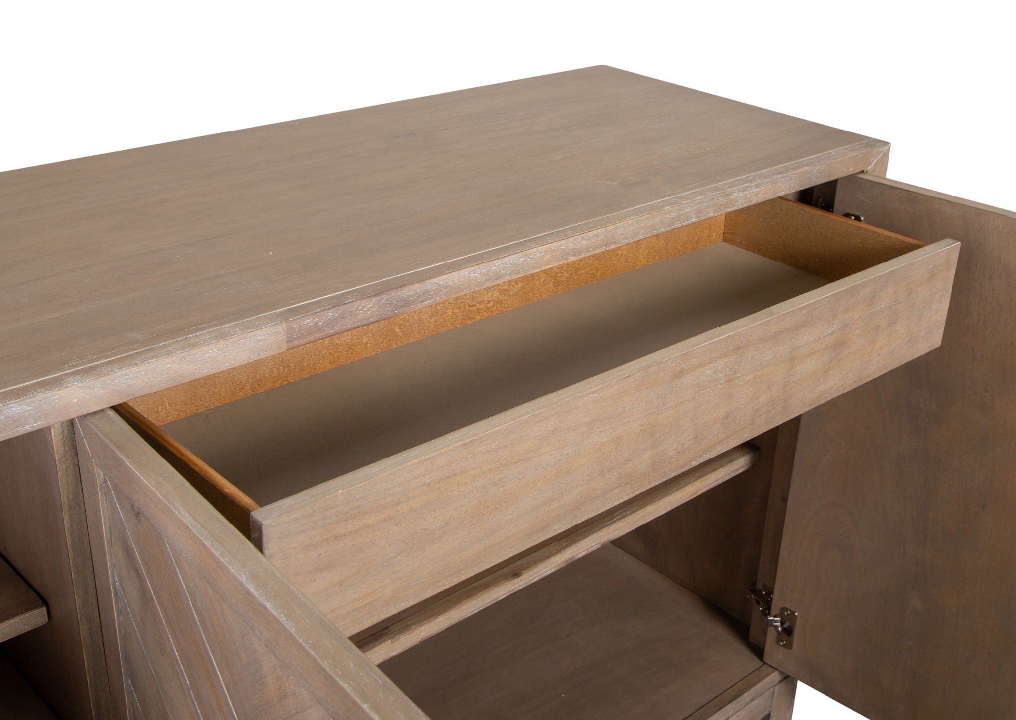 Industrial style gets a light and airy vibe with the soft organic color palette of the Ainsley Dining Collection and featuring a tactile Cerused Khaki finish with a subtle gray wash on exotic and elegant Acacia Solids and Veneers. Adding character to this collection are exquisite book-matched veneers in an X-motif on case fronts and metal ferrules on the base of the round dining table and metal brackets on the edges of the rectangular Parson’s leg Dining Table and the Parson’s Leg Bench and all in an Industrial Bronze finish. The Display Cabinet combines the book-matched pattern at the bottom of the two doors with glass on the top of each door. Chair choices in the collection include a modified Windsor chair with an upholstered seat and upholstered host and side chairs. Create an uplifting setting in soothing natural colors and textures for memorable meals with the Ainsley Collection.