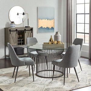 Channel mid-century charm with this armless side chair, wrapped in soft textured grey fabric. Its sleek wingback-inspired profile and gently tapered gunmetal legs bring a fresh, modern edge to dining spaces. Padded for comfort and built with durable materials, this chair offers a timeless silhouette that pairs effortlessly with a variety of table styles and finishes.