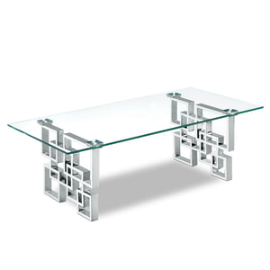 Enjoy a contemporary look in your living room or den with this stylishly elegant Alexis chrome coffee table. This Meridian Furniture table is made from glass and metal for a sleek, modish look. The base features a geometric design with intertwined squares that form two pedestals. The top is crafted from thick, clear glass that allows the beauty of the base to shine through completely. A chromed finish shores up the design, adding to its up-to-the-minute feel.