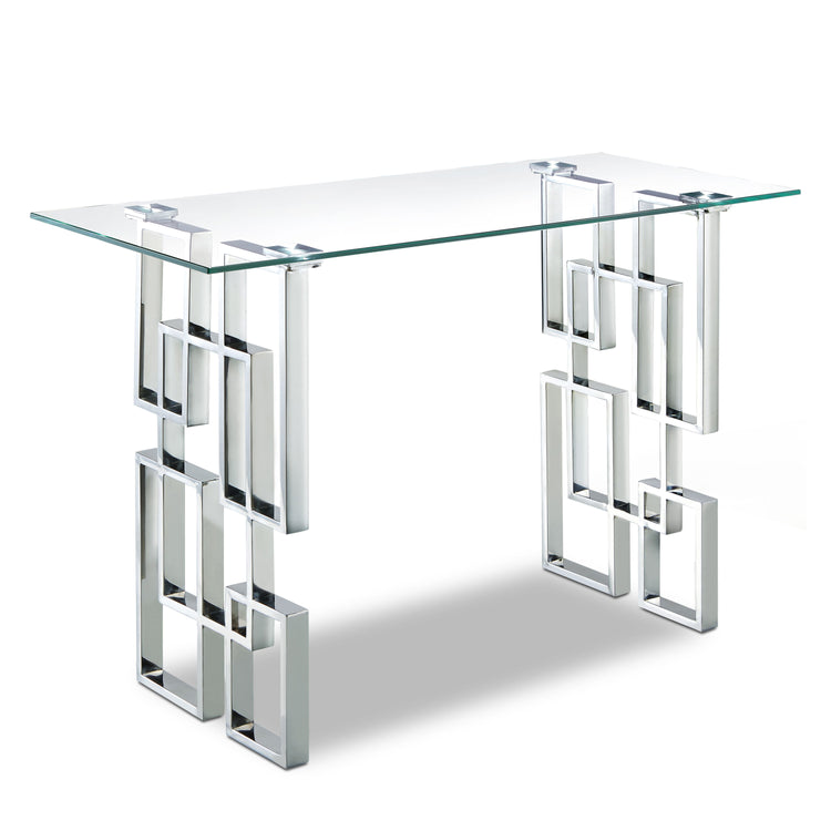 Enjoy a contemporary look in your living room or den with this stylishly elegant Alexis chrome console table. This Meridian Furniture table is made from glass and metal for a sleek, modish look. The base features a geometric design with intertwined squares that form two pedestals. The top is crafted from thick, clear glass that allows the beauty of the base to shine through completely. A chromed finish shores up the design, adding to its up-to-the-minute feel.
