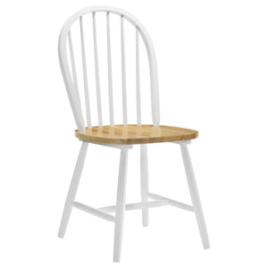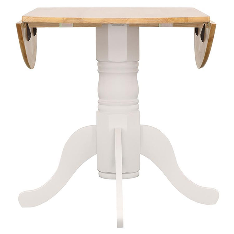 Bring your dining space a light, airy ambiance with this two-tone five-piece dining set. The set includes a round table with drop-down leaves that either save space or extend for unexpected company and four spindle back chairs with wood seats. The table also comes with a prominent pedestal base that's both stylish and supportive. Each chair has angled legs that give it a more assertive appearance. The tabletop and seats are crafted with a natural brown finish while the table base, legs, and seat backs all come in a brilliant white finish.