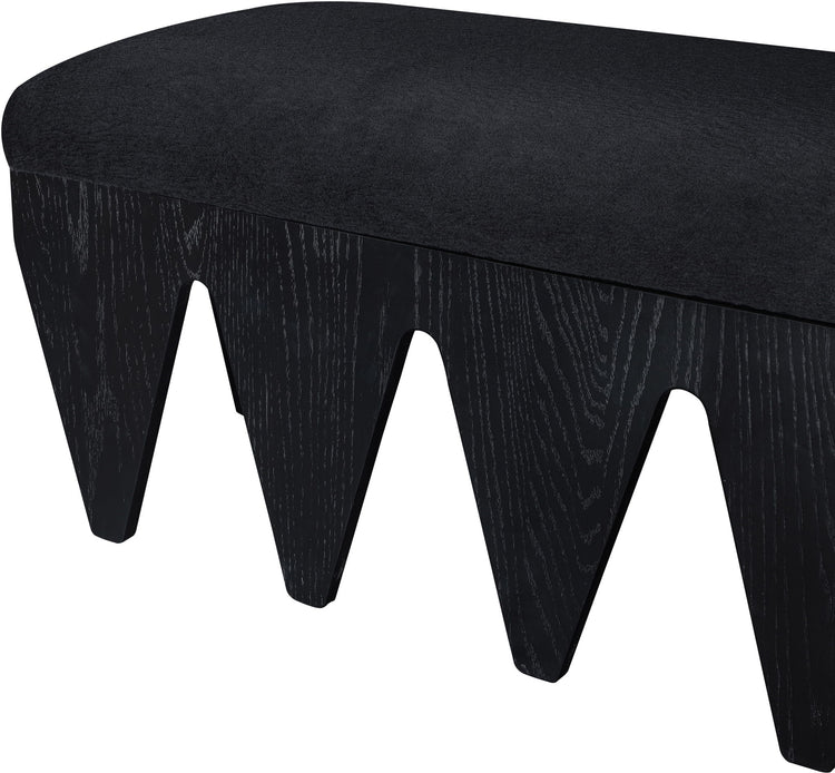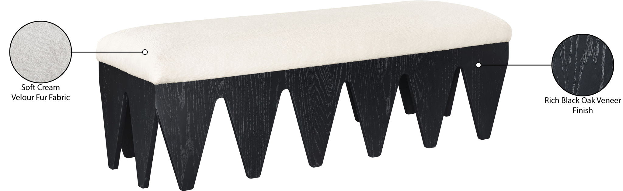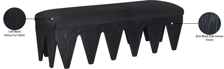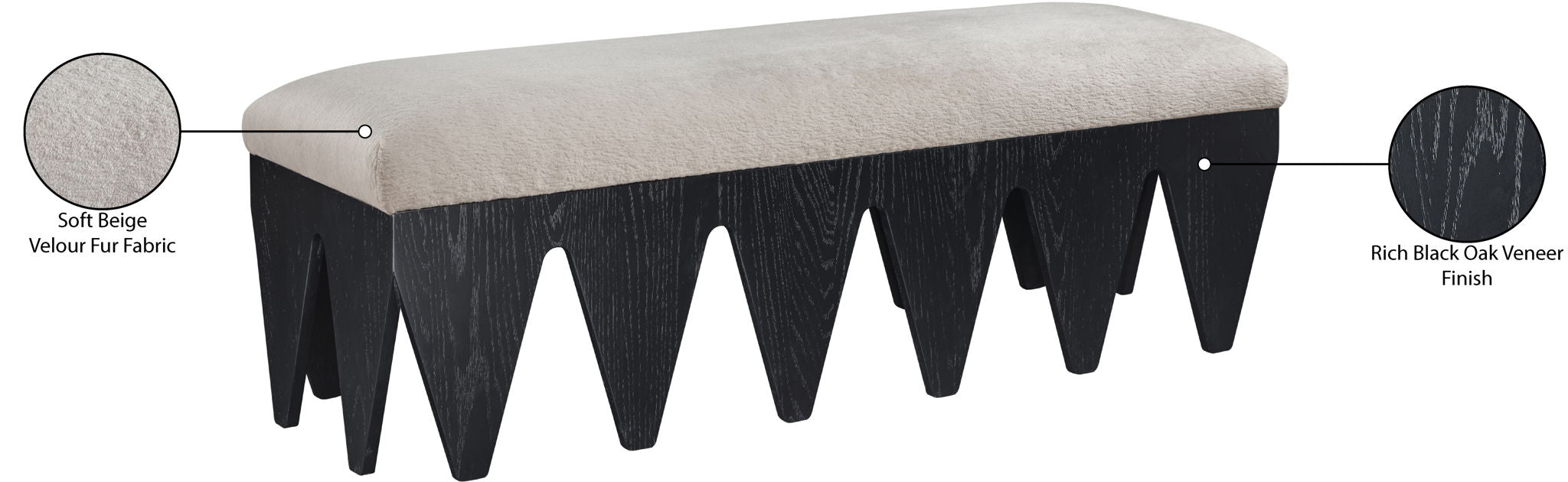 Bold and architectural, the Altair velour fur fabric upholstered bench combines avant-garde design with plush luxury. The seat is covered in soft velour fur fabric, offering an indulgent texture that invites you to sit and relax. Its distinctive rich black oak veneer wooden base, featuring sharp, angular legs, brings a sculptural, modern touch to any room.