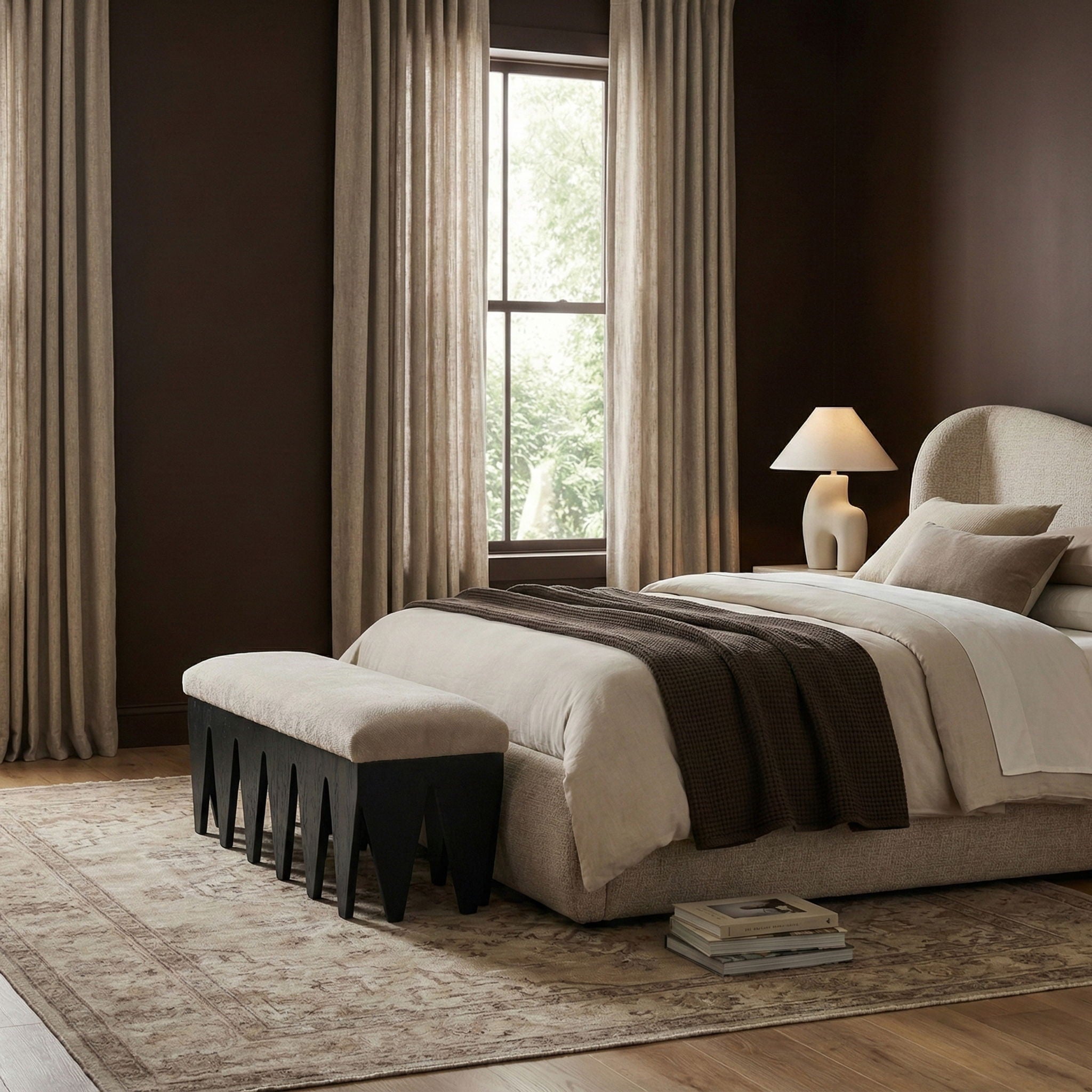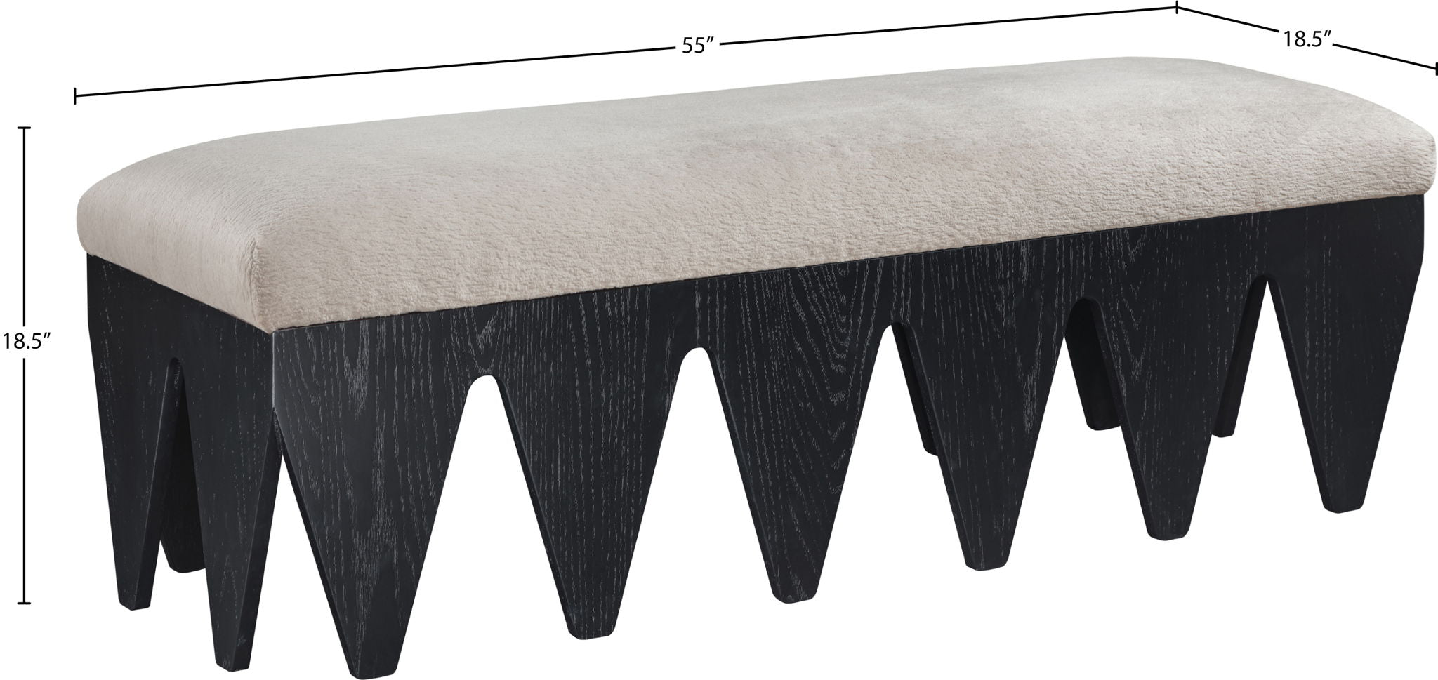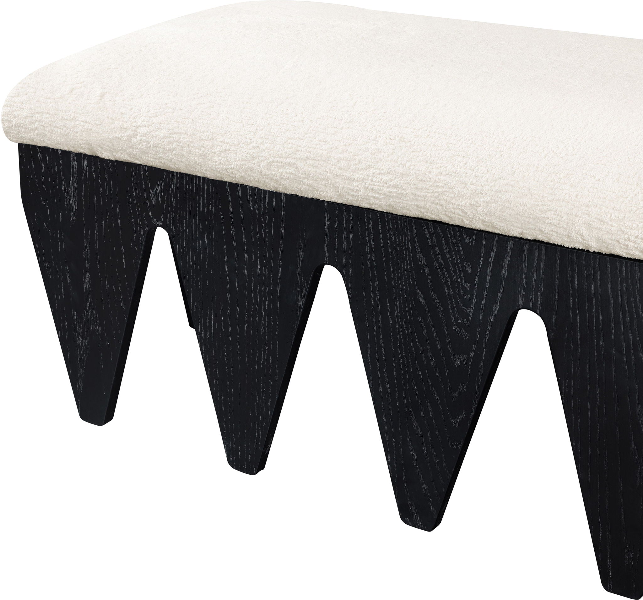 Bold and architectural, the Altair velour fur fabric upholstered bench combines avant-garde design with plush luxury. The seat is covered in soft velour fur fabric, offering an indulgent texture that invites you to sit and relax. Its distinctive rich black oak veneer wooden base, featuring sharp, angular legs, brings a sculptural, modern touch to any room.
