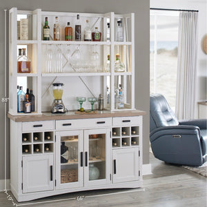 Beautiful display space meets functionality with our Americana Modern Grand Casual Buffet with open display hutch. Fresh hand-painted Cotton finish with Weathered Natural top on buffet gives a timeless charm. Quartz top insert makes and ideal surface for food preparation and serving. Hutch has all the details to highlight your favorite items, with three-way touch lighting and mirrored back panel. Hanging stemware storage elegantly stores glassware. A definite conversation piece that also provides perfect storage for all your dining and entertaining needs.