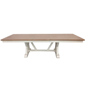This stunning set is designed to accommodate groups of varying sizes with its expandable table top, making it perfect for large family gatherings or intimate dinner parties. The fashionable apron of the table reflects vintage influences, adding and extra touch of style to your dining room. with the included 24" leaf, the table comfortably seats 6-8 people and can expand to seat up to 10, ensuring that everyone has a place at the table. The trestle-style base of the table adds drama and substance, making a statement in any dining room. Two chairs fit comfortably between each trestle base support, allowing for ample leg room and ensuring that everyone at the table is comfortable. The chairs are upholstered in a neutral, textural, multi-tone fabric that complements all furnishings, ensuring that this set will look beautiful in any dining room. The chairs are designed with comfort in mind, allowing you to sit back and enjoy your meal in style. Whether you're hosting a holiday feast or a casual dinner party, this set will make your dining room the perfect gathering place for years to come.
