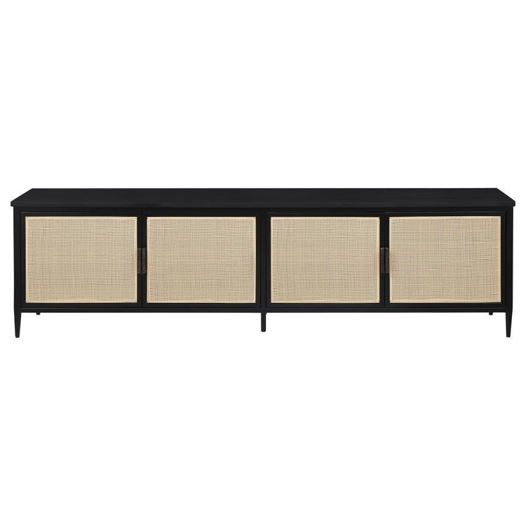 Upgrade your entertainment space with this stunning 78-inch TV stand, designed to accommodate up to an 80-inch TV. Featuring four door cabinets with elegant radio weave polyethylene (PE) rattan fronts, this stand combines modern style with natural texture. The sturdy metal frame, coated with a sleek black powder finish, ensures durability while maintaining a contemporary aesthetic. Inside, two cabinets offer fixed shelving with four total compartments, each equipped with cable access to keep your devices organized and tidy. This TV stand blends style and practicality, making it a perfect addition to any sophisticated living room.