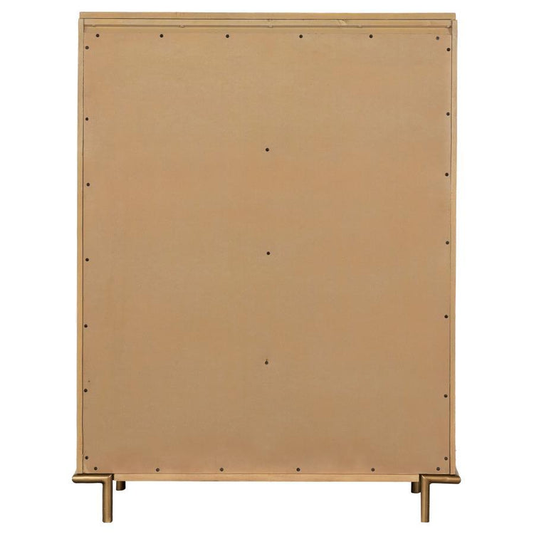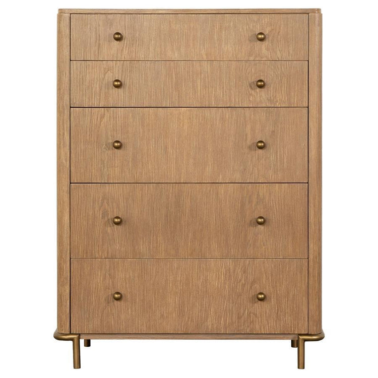 This charming mid-century, modern, five-drawer chest offers a gorgeous contemporary glam look with its softly rounded corners and aged brass metal hardware. A neutral sand wash wood tone with a wire-brushed finish adds texture and warmth to bedrooms. Clever details like a soft felt-lined top drawer for delicates offer a finishing touch to complete your sophisticated bedroom retreat.