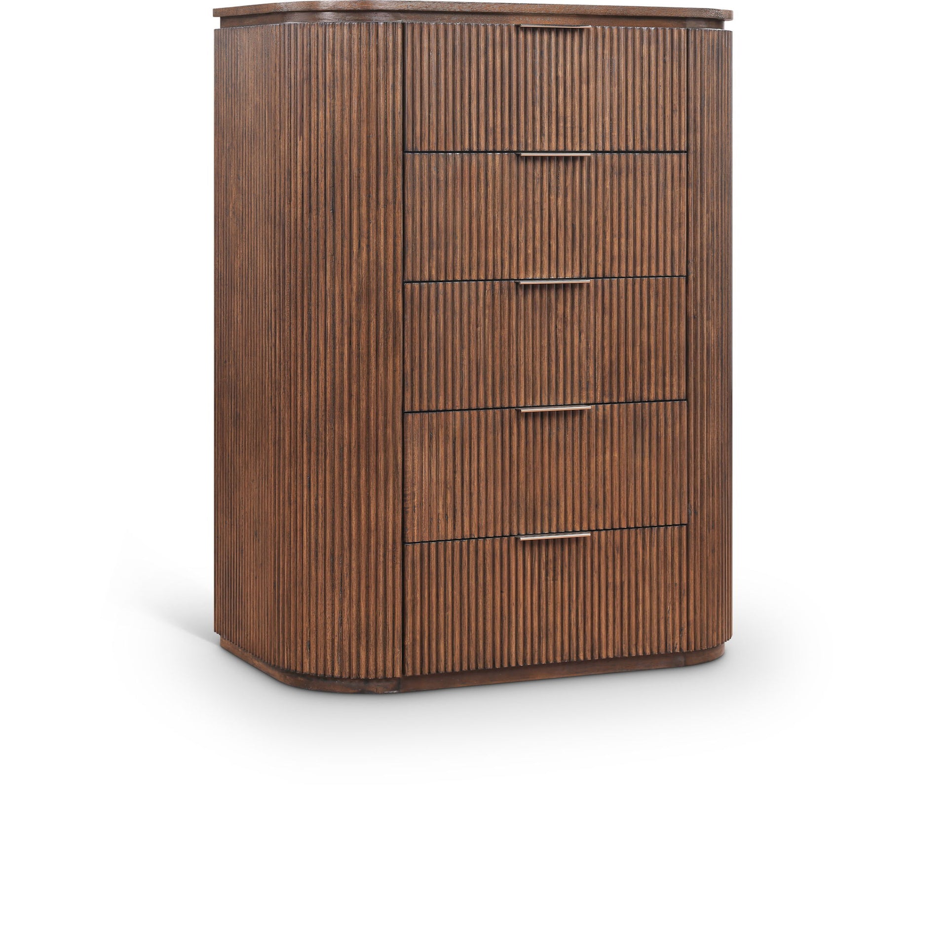 Texture takes the lead with the Astrid solid wood and oak veneer chest. Wrapped in sleek fluted wood and finished in a deep, moody tone, this contemporary design is both bold and refined. Whether styled in a bedroom or living space, it delivers effortless storage with standout style.