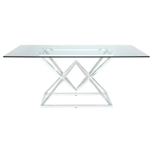 Elevate your dining space with this contemporary dining table featuring a 12mm clear glass top and an artistic polished stainless steel base. The angular geometric design adds a modern flair, while the rectangular shape offers generous space for entertaining. With its sleek materials and sophisticated presence, this table is perfect for creating a luxurious and upscale atmosphere in any dining room.