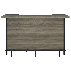 Add functionality and style to an entertainment space with this rustic bar unit, appointed in a gray driftwood-inspired finish with distinctive metal details throughout. Perfect for holding and organizing barware, bottles and all your mixologist essentials, this bar offers six stemware racks and a 12-bottle wine holder. In addition, five open cubbies and compartments can keep all your libations. Pull up a stool to this U-shape bar and rest your feet on the attached footrest, designed from a heavy gauge, black powder coated metal. With a tiered design in back, you can create a neat and tidy bar for country-inspired homes and apartments.