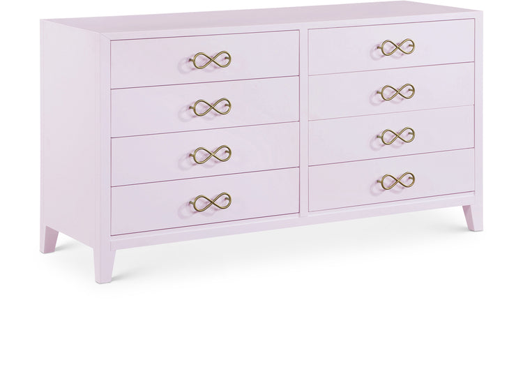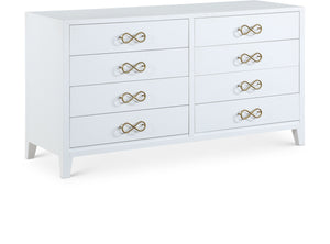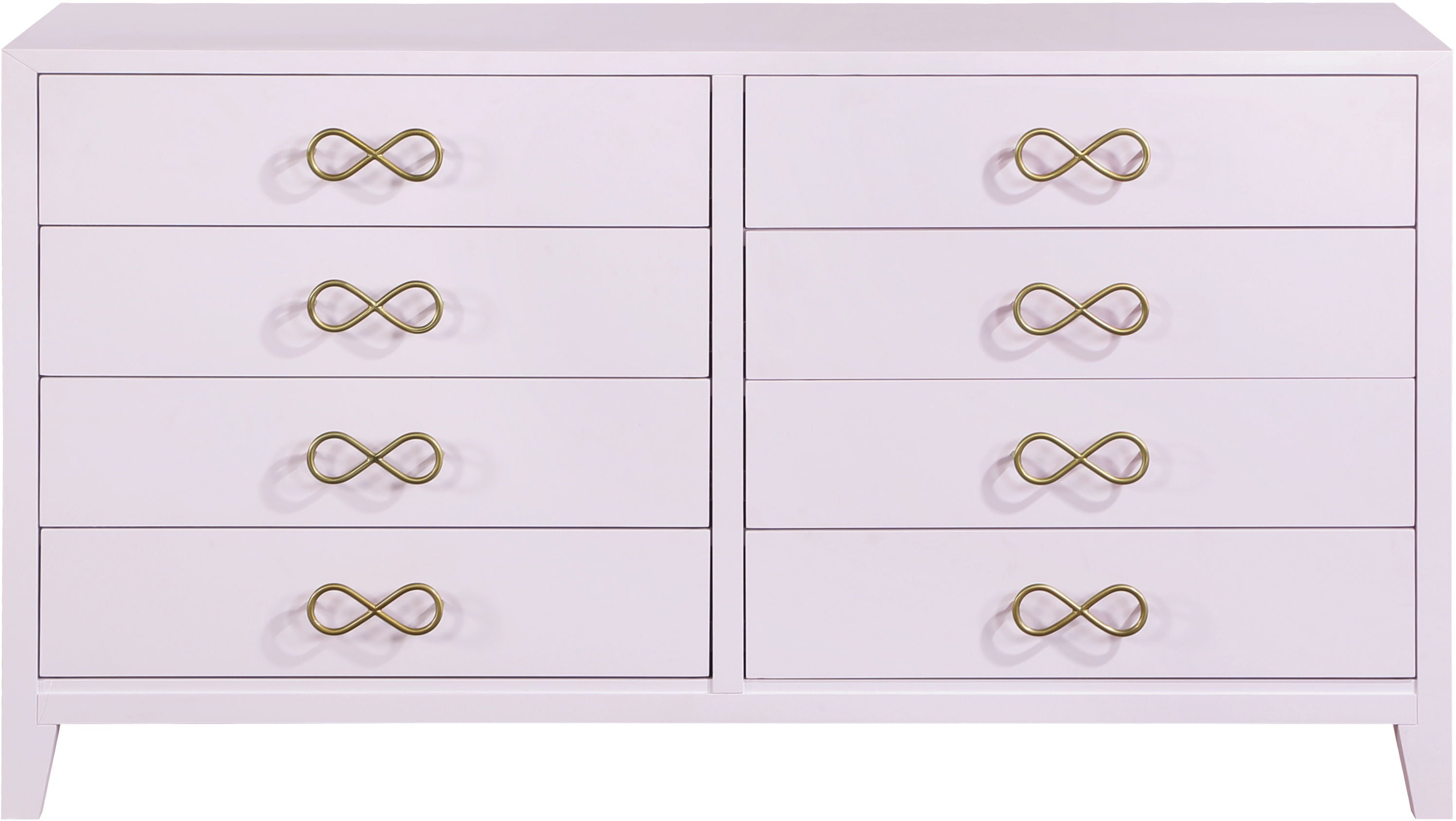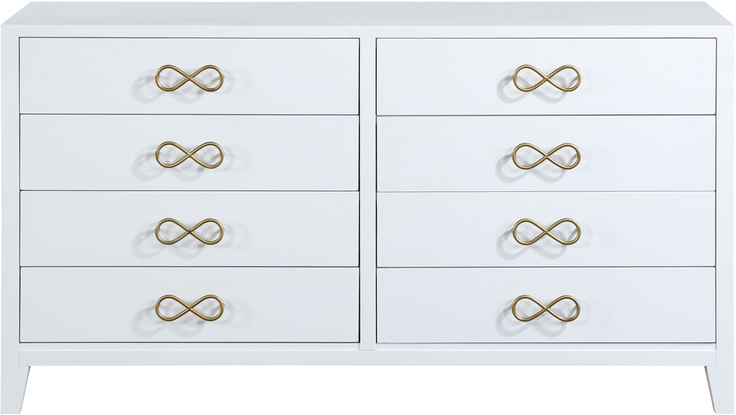 Bring unique elegance to your bedroom with this Bowtie dresser from Meridian Furniture. This dresser features eight drawers, providing you with plenty of storage space for clothes, linens, or miscellaneous objects. Its light color adds a touch of femininity to your living space, and its brushed bow tie handles complement your existing decor. Its flat top is perfect for placing a lamp, framed picture, books, bric-a-brac, and more.