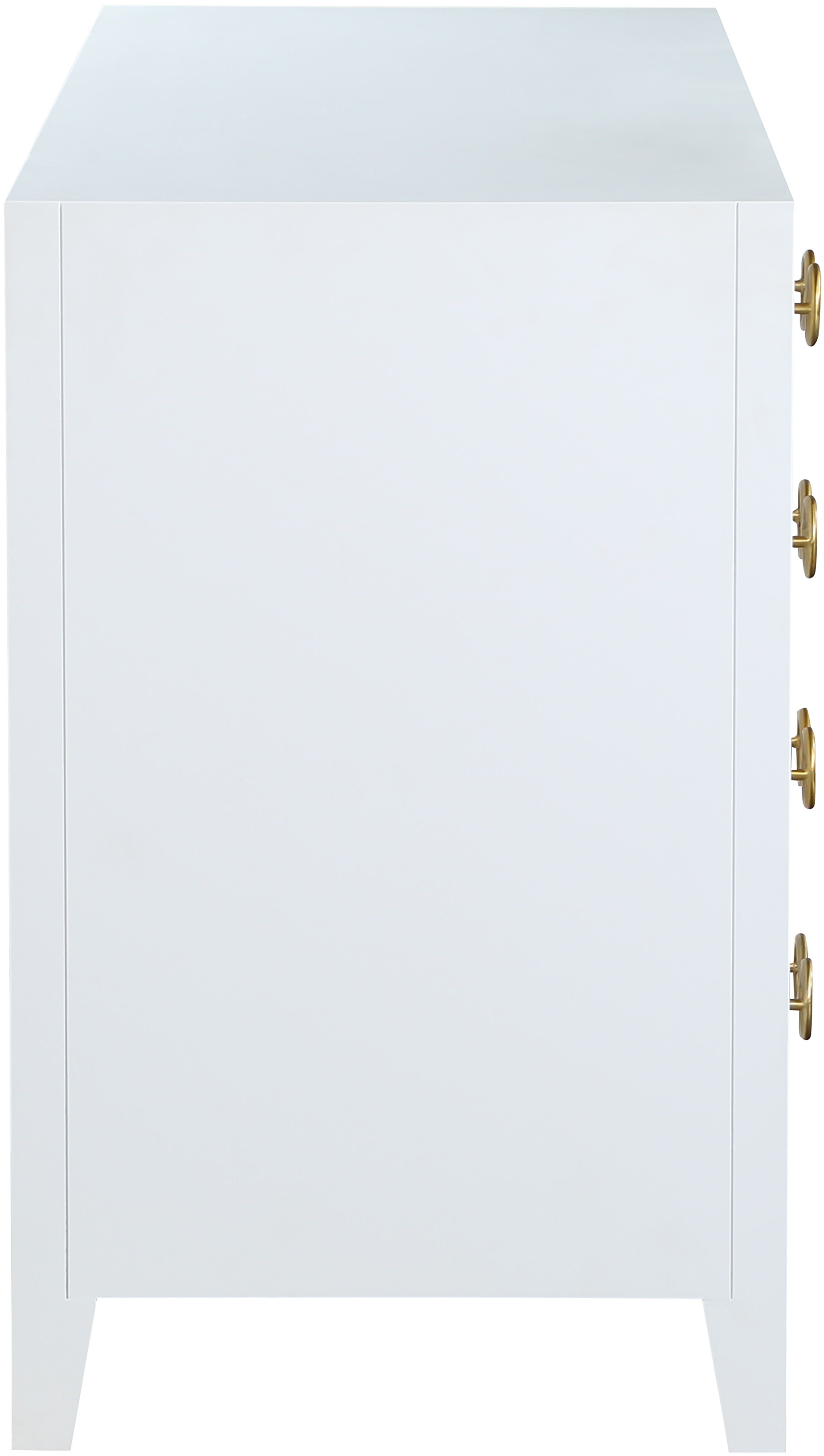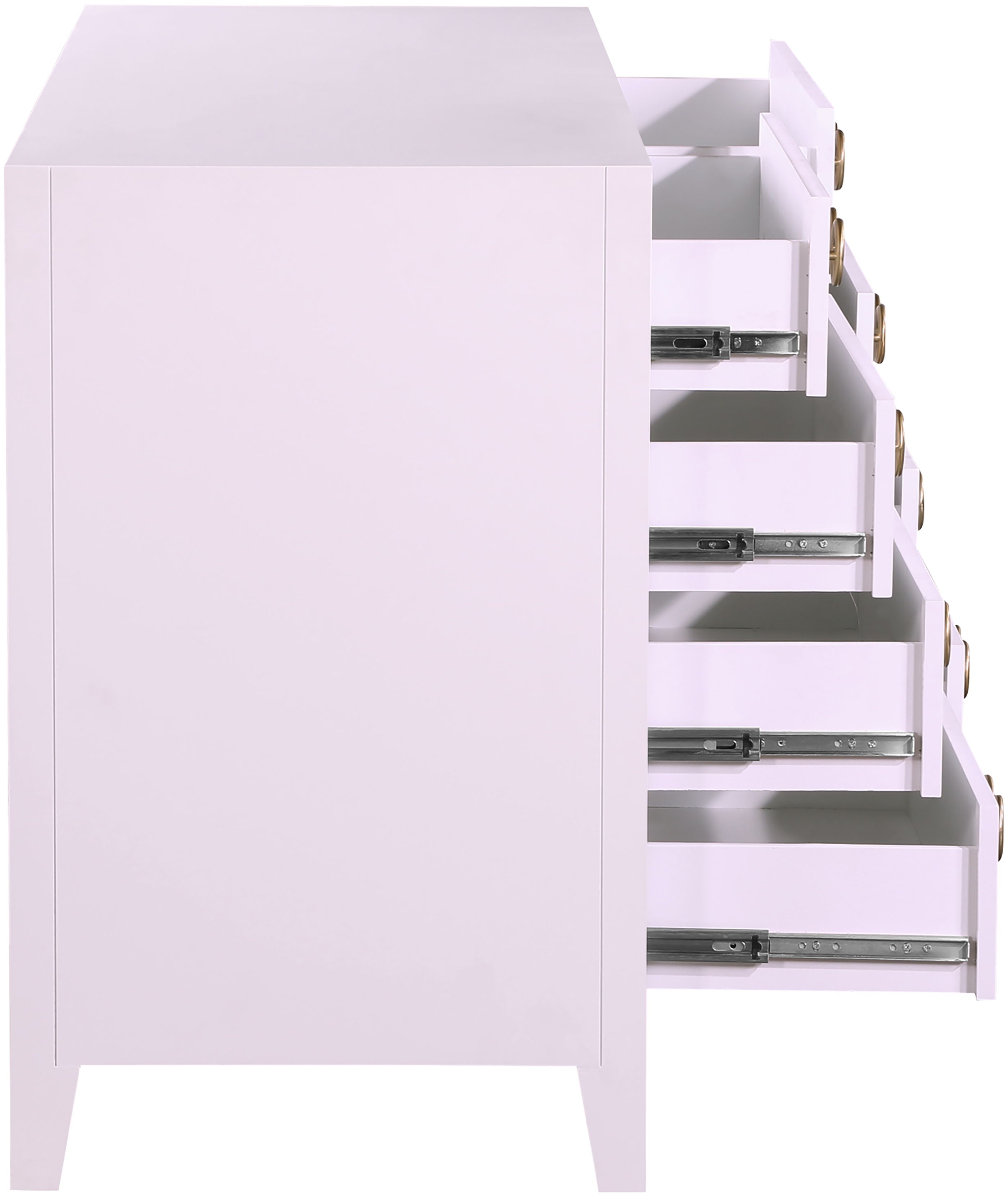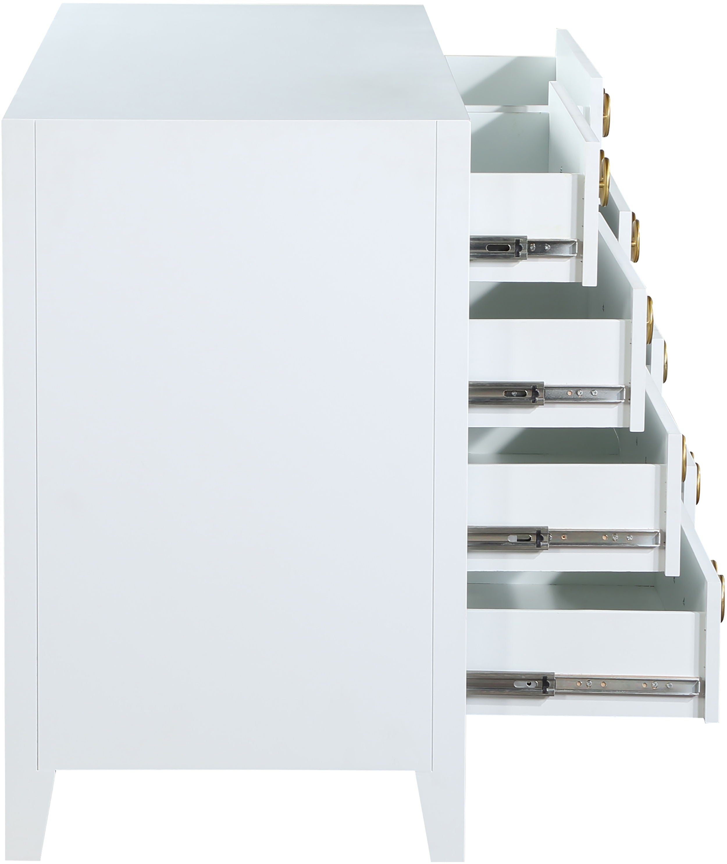 Bring unique elegance to your bedroom with this Bowtie dresser from Meridian Furniture. This dresser features eight drawers, providing you with plenty of storage space for clothes, linens, or miscellaneous objects. Its light color adds a touch of femininity to your living space, and its brushed bow tie handles complement your existing decor. Its flat top is perfect for placing a lamp, framed picture, books, bric-a-brac, and more.