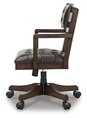 Classic meets contemporary in this home office chair. With a rich dark wood tone and tufted faux leather, it suits today’s trends while balancing a timeless appeal. Casters provide easy mobility, while the adjustable seat allows you to find your perfect position for work, study or gameplay.