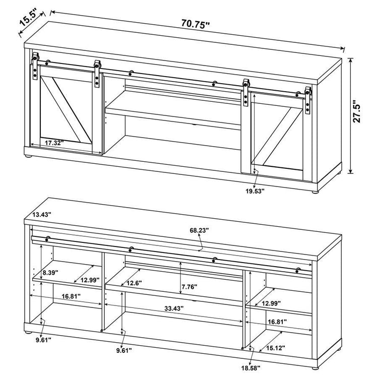 Whether you place it in a rural farmhouse, or downtown penthouse, this TV console is sure to be a hit. Clean lines give a nod to modern style. The distressed look definitively boasts of the rustic nature of this piece. Dream of life on the farm with two (2) sliding barn doors. Complement your space with your choice of colors and sizes.