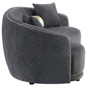 Put a sophisticated spin on living room decor with a modern two-piece sofa and loveseat set. Designed to impress, each piece boasts dark grey upholstery that's velvety soft and trimmed in gold that adds metallic gleam and warm contrast. The gentle curvature of the sofa and loveseat silhouettes bring elegant flair to your living room. The outer surface of the back and arms adds diamond texturing, while vertical channel tufting adds dimension to the interior of each piece. The sofa adds a gold ball accent pillow and two in matching grey, while the loveseat includes two pillows in grey for added comfort.