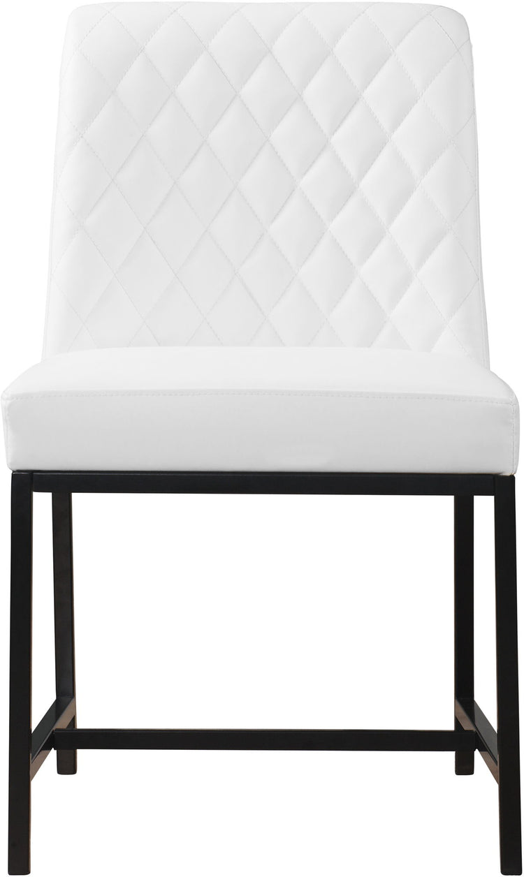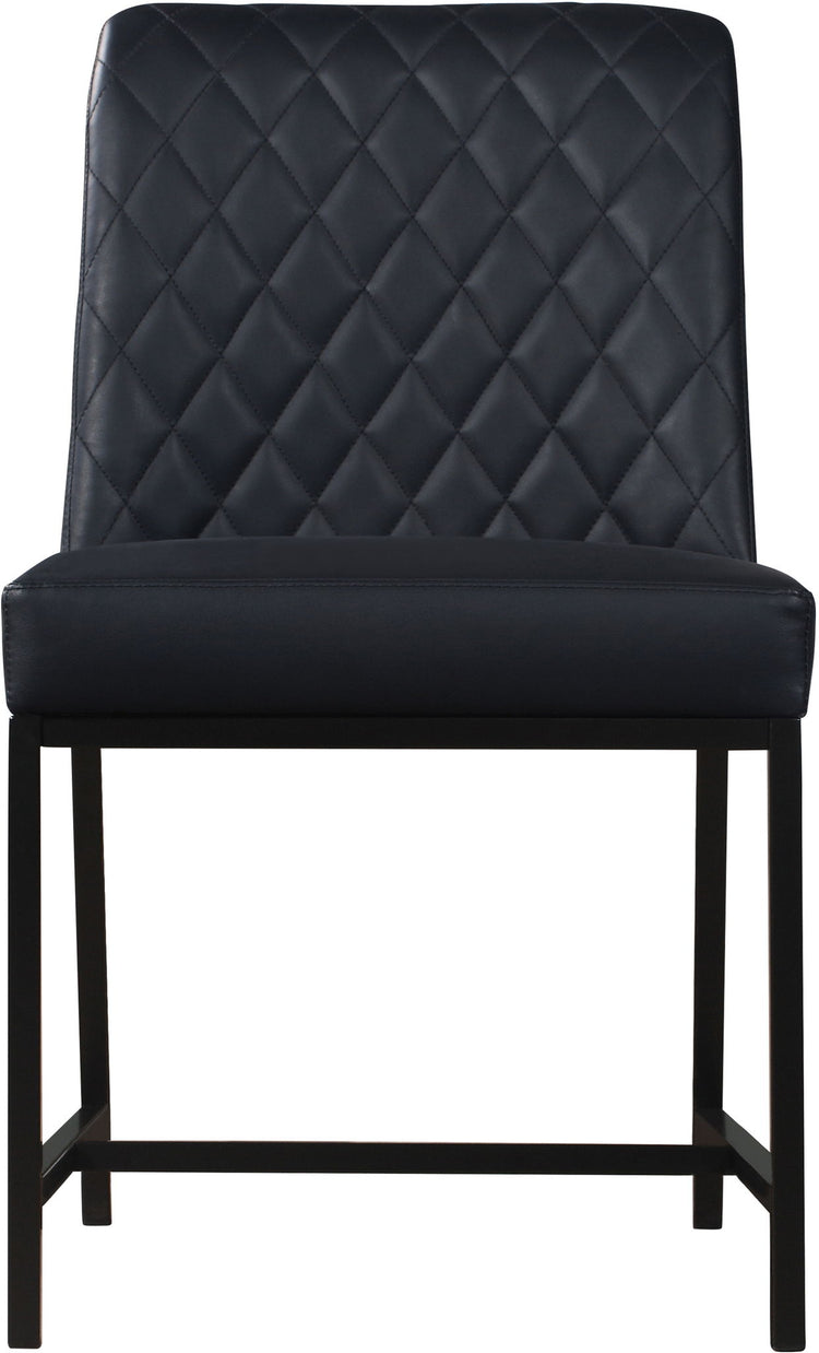 Give your dining room a revamp with this Bryce Faux Leather Dining Chair from Meridian Furniture. This handsome chair features an armless design with heavily padded seat and back cushions, ensuring that guests stay comfortable all the way through dessert. The back is quilted for added aesthetic appeal, and it's upholstered in faux leather for the luxury look of leather without the maintenance requirements. A metal frame and matte metal legs complete the look and provide sturdy support.