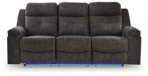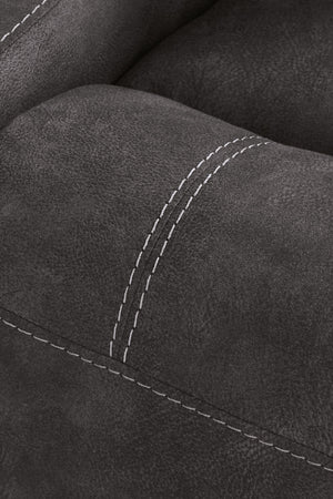 Seamlessly blend contemporary aesthetics and uncompromising comfort with this reclining sofa. Its handsome charcoal-hued faux leather has a tailored appeal thanks to sizable stitching details. As for modern convenience? The simple one-pull reclining and ambient LED lighting encourage you to relax in style.