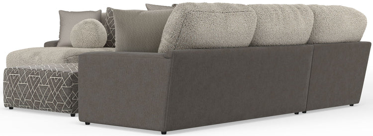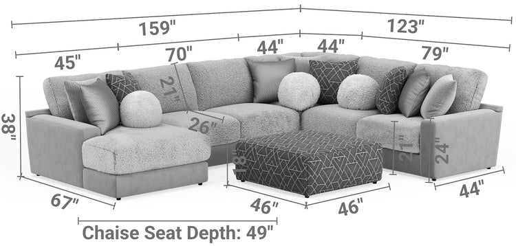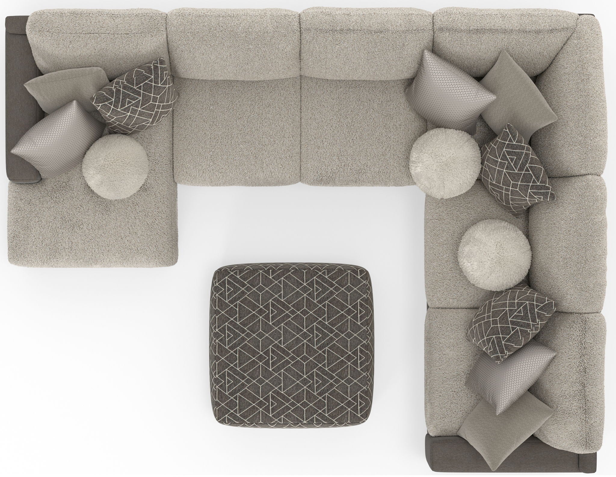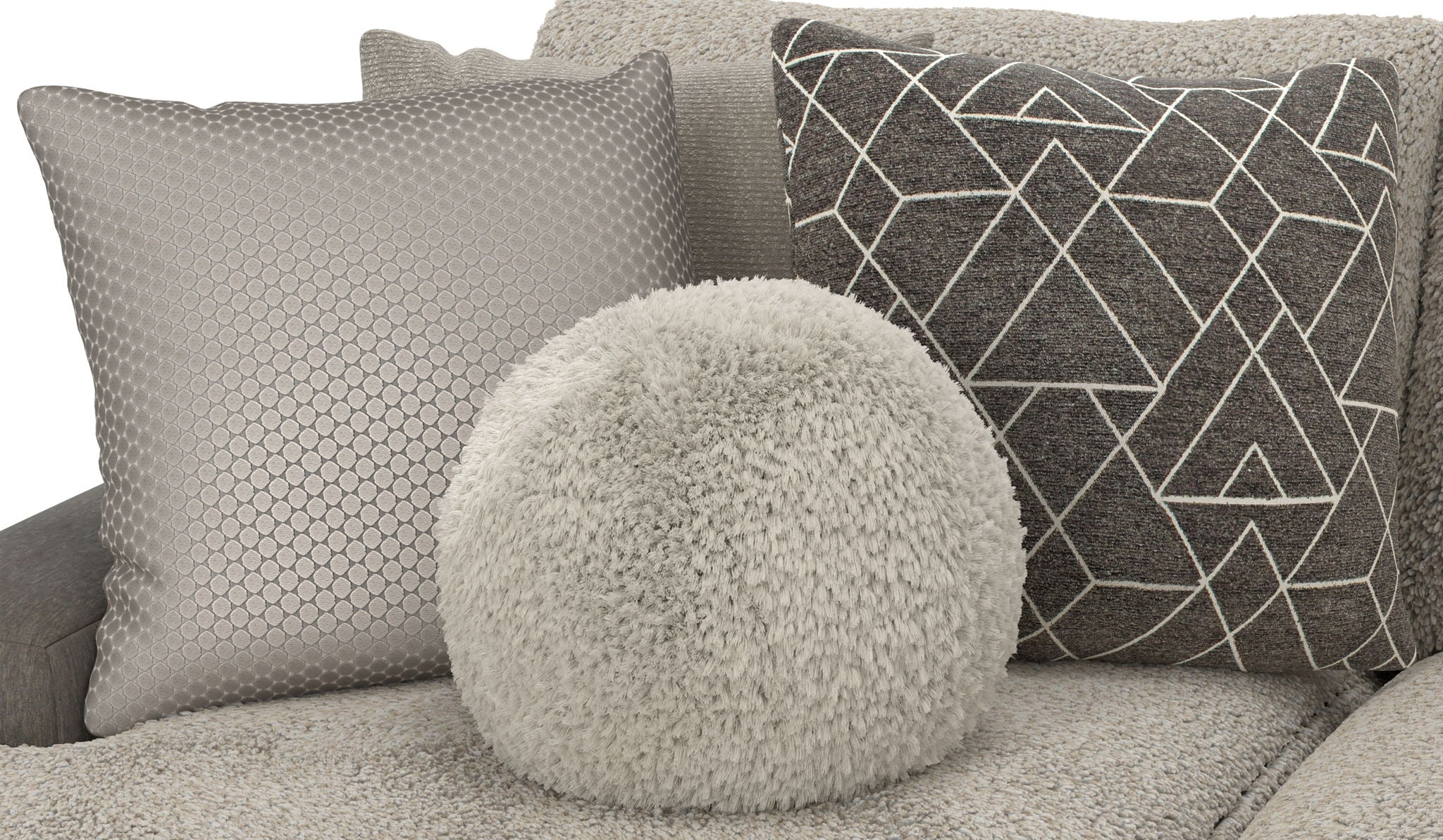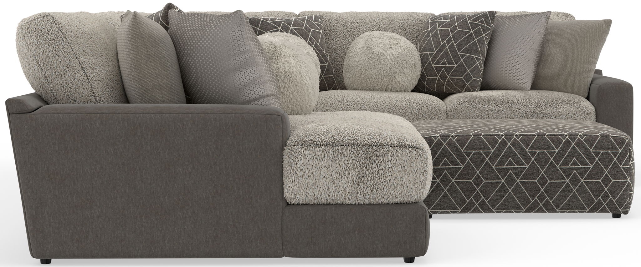 Canyon is a stationary Modular Sectional group that the ultimate comfort of our Cuddler Cushion. This dual-fabric application is accented with an ecelectic mix of toss pillows in a variety of textures - including sphere pillows in a luxurious faux fur. Canyon includes a convenient Cocktail Ottoman and is available in your choice of two color combinations: Slate/Fawn or Platinum/Grey.