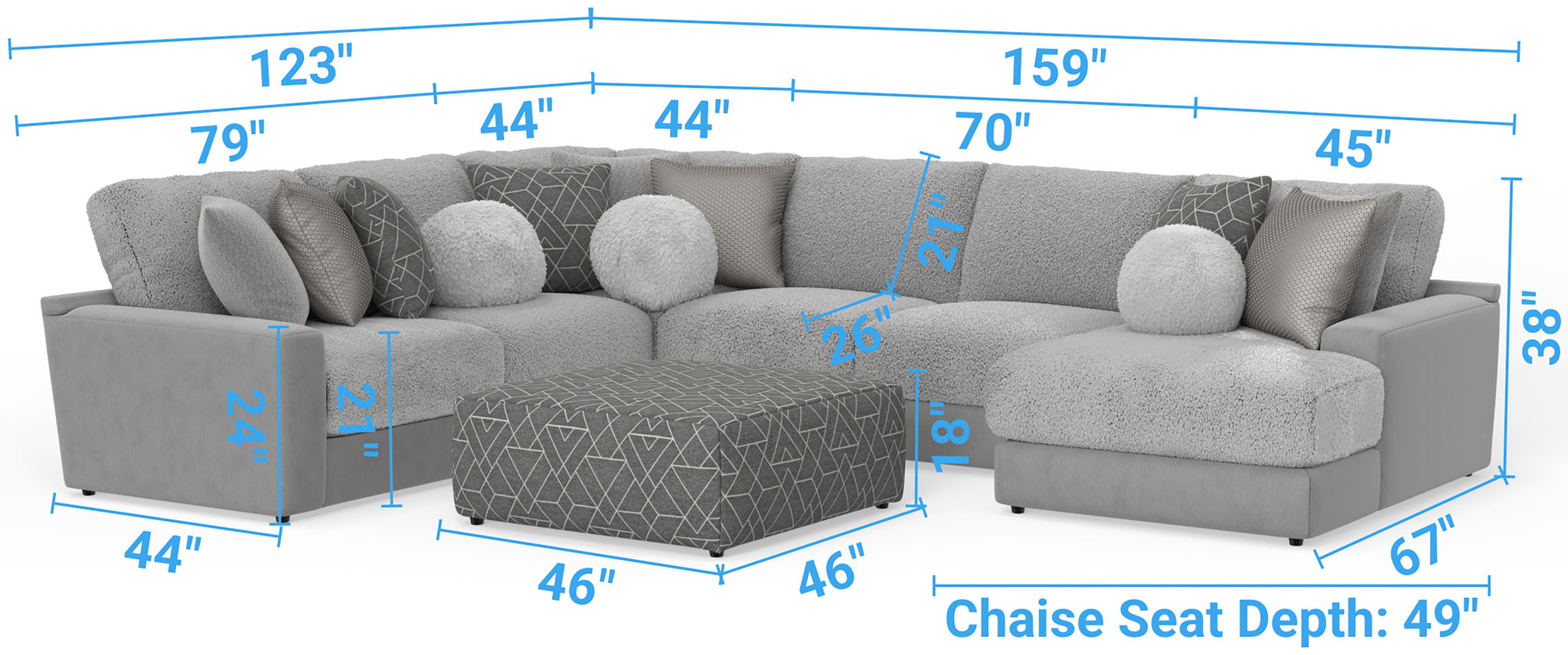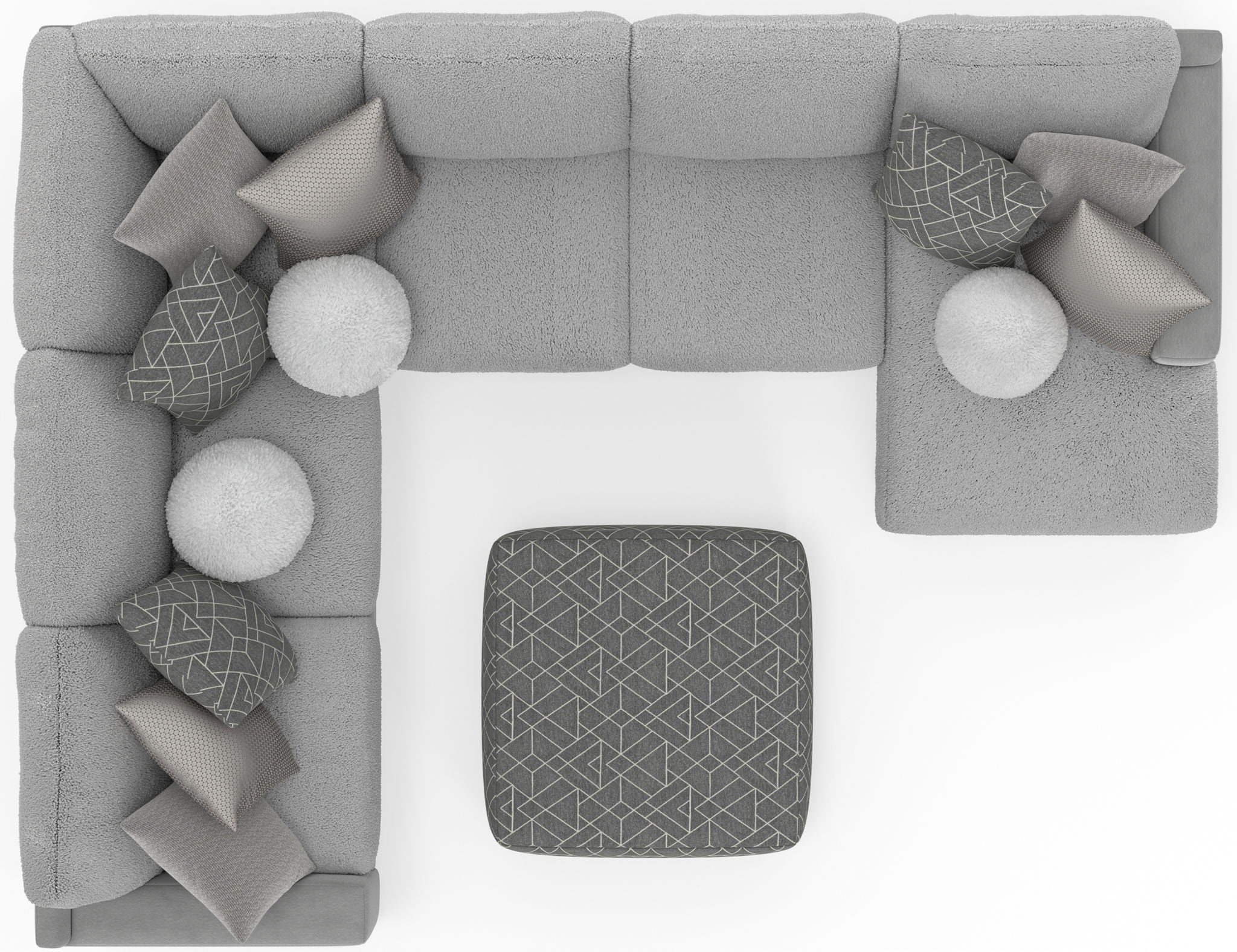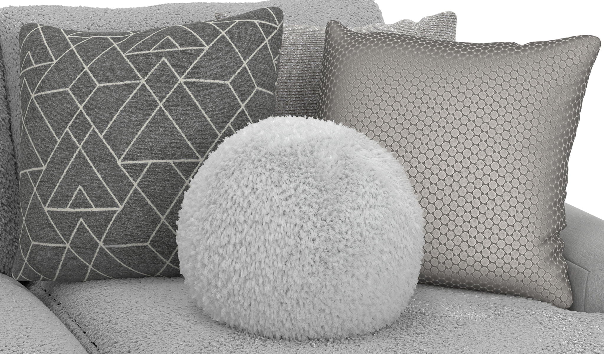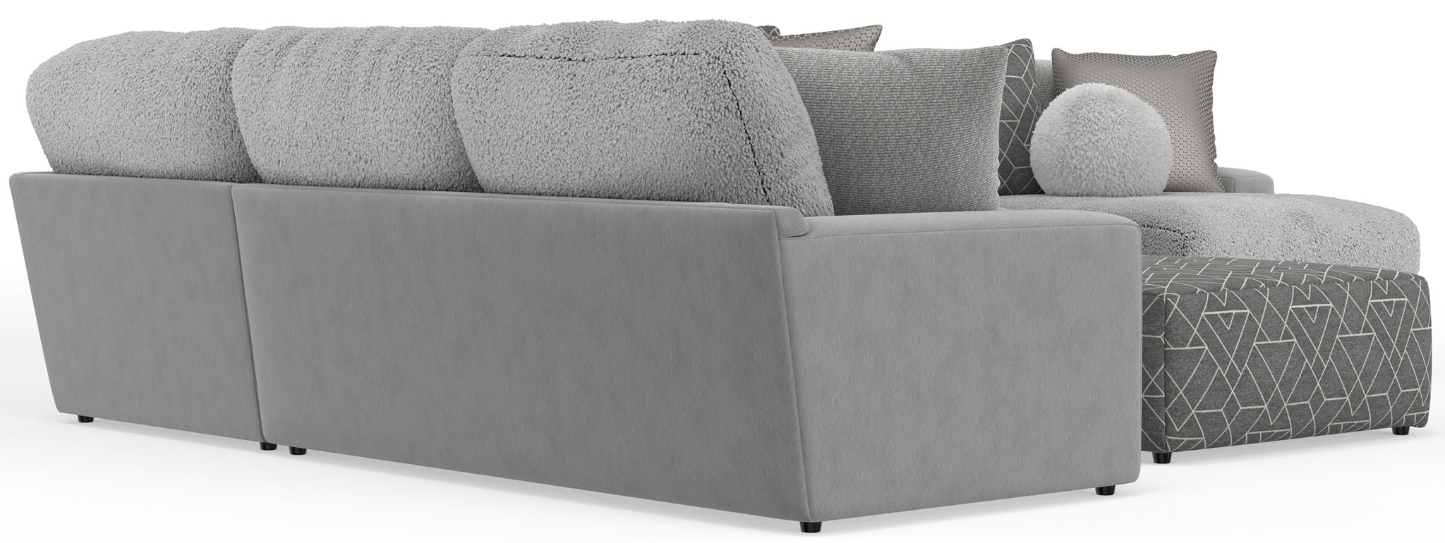 Canyon is a stationary Modular Sectional group that the ultimate comfort of our Cuddler Cushion. This dual-fabric application is accented with an ecelectic mix of toss pillows in a variety of textures - including sphere pillows in a luxurious faux fur. Canyon includes a convenient Cocktail Ottoman and is available in your choice of two color combinations: Slate/Fawn or Platinum/Grey.