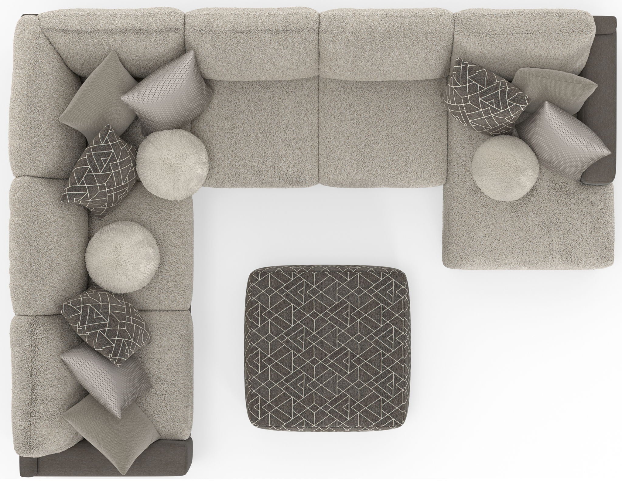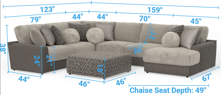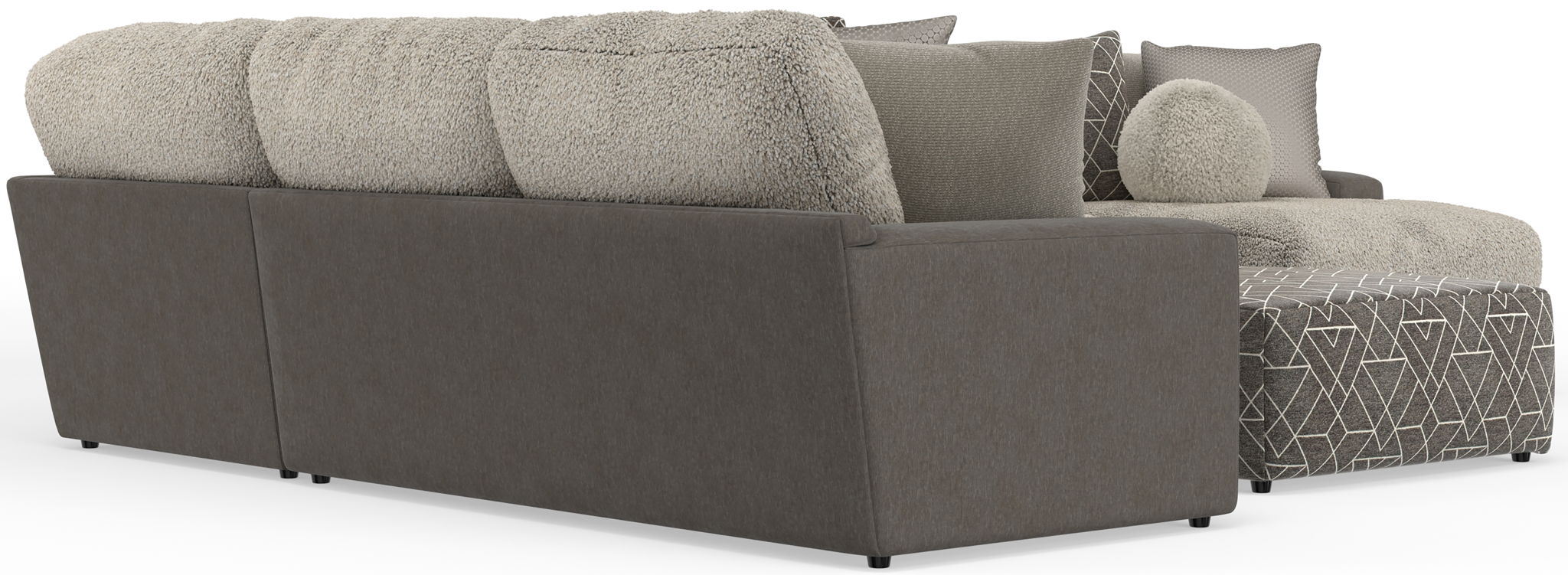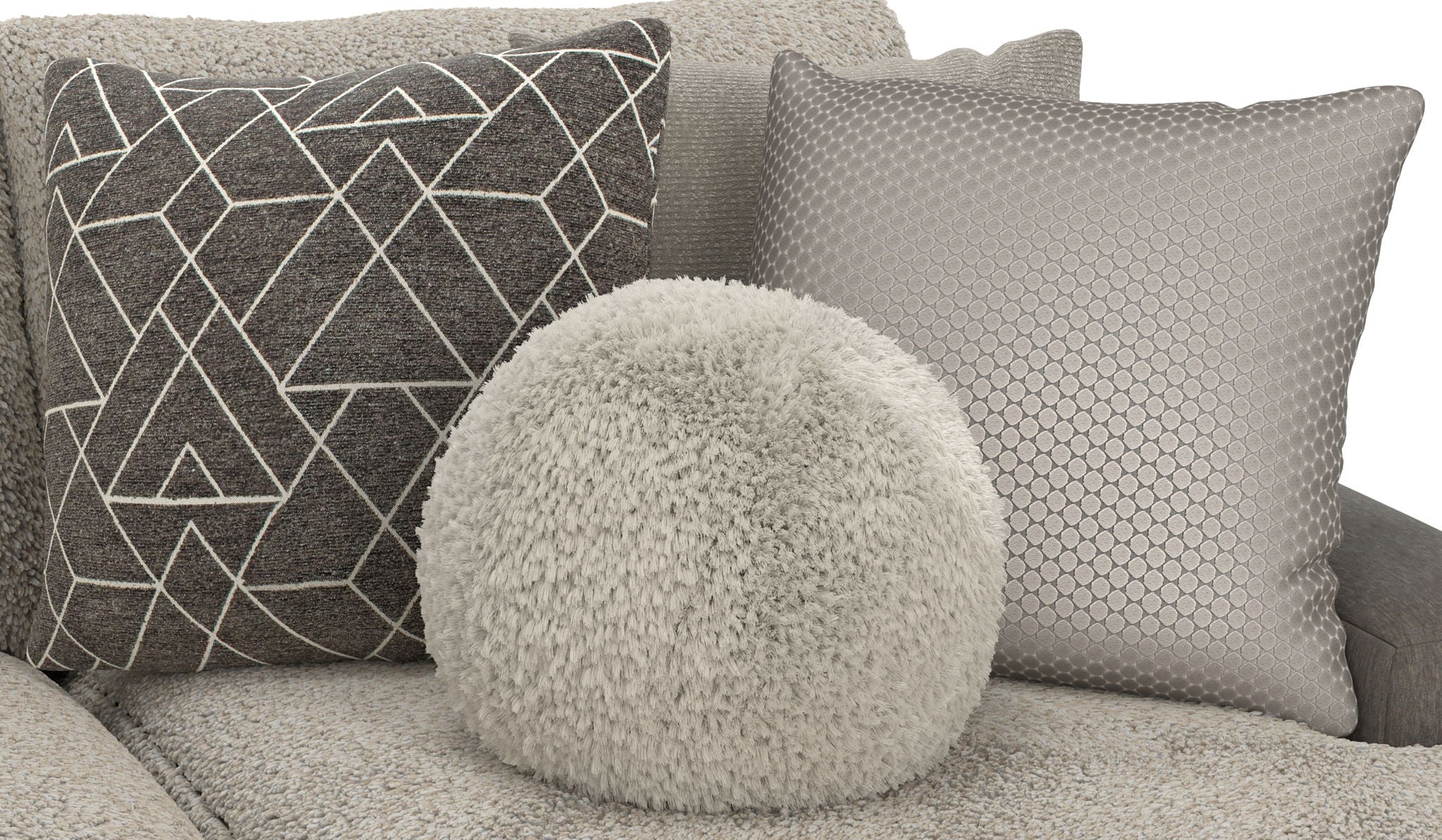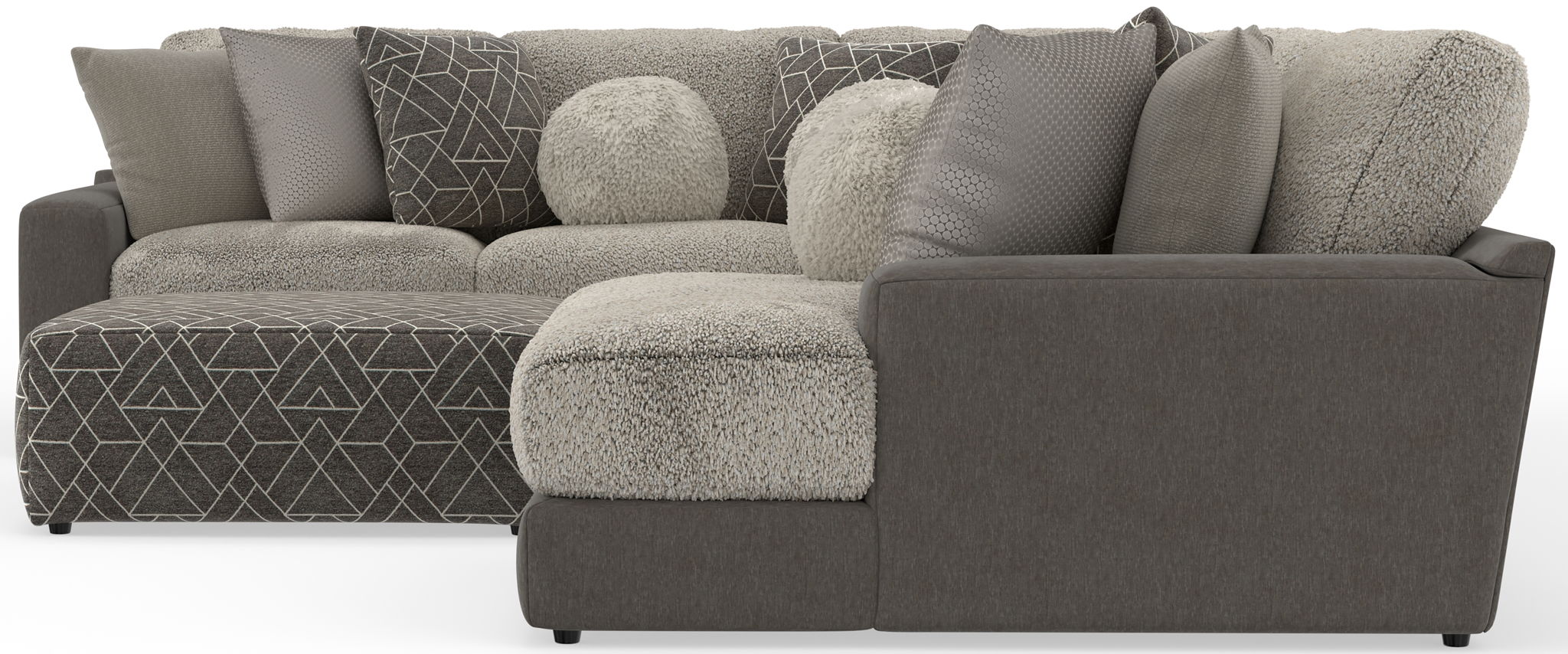 Canyon is a stationary Modular Sectional group that the ultimate comfort of our Cuddler Cushion. This dual-fabric application is accented with an ecelectic mix of toss pillows in a variety of textures - including sphere pillows in a luxurious faux fur. Canyon includes a convenient Cocktail Ottoman and is available in your choice of two color combinations: Slate/Fawn or Platinum/Grey.