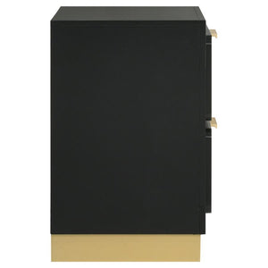 Put the finishing touches on a chic bedroom with a modern two-drawer nightstand. With metallic gold embellishments, it's the perfect solution for nighttime storage. Drawer fronts feature rounded corners for a softened look and feel. Use the top for a reading lamp or personal decor that brings inviting ambiance. Drawers hold up to 44 pounds each, perfect for everything from personal items to books and other accessories.