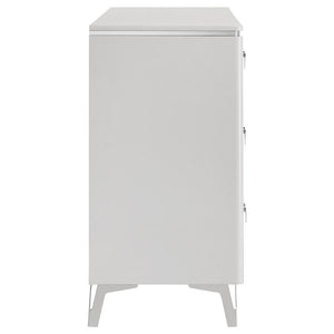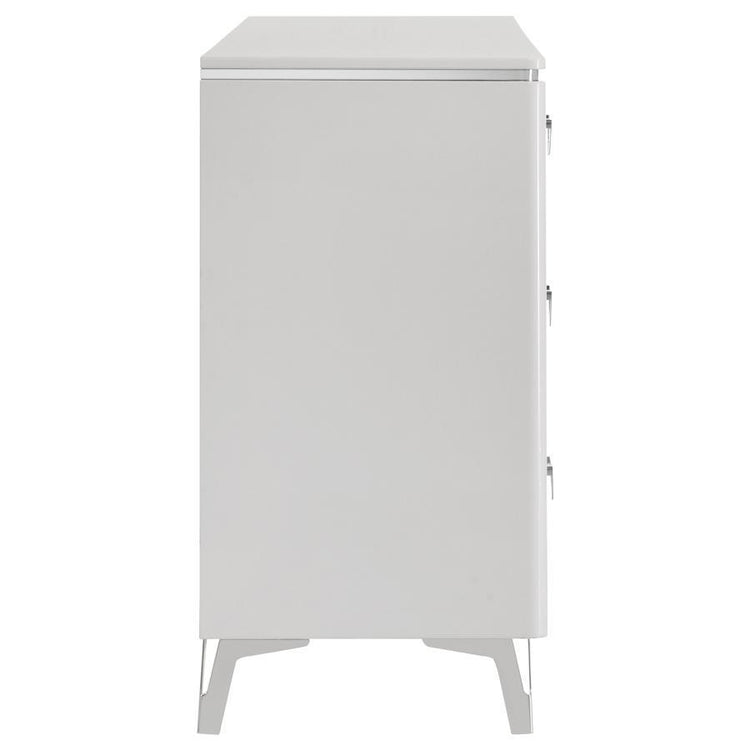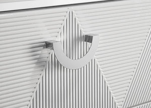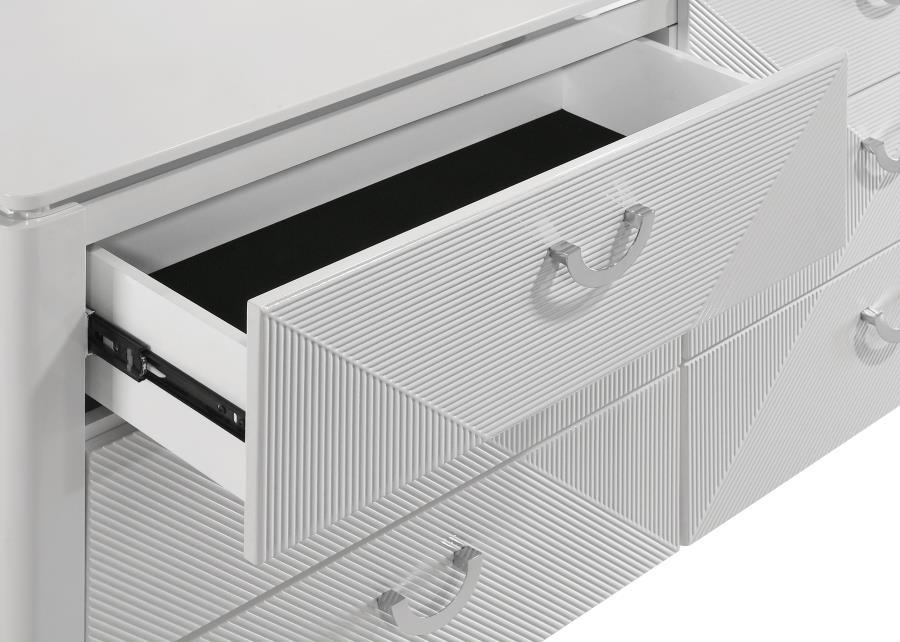 Sleek and sculptural, this six-drawer dresser pairs crisp white high gloss with dimensional detail for a bold modern look. Its geometric drawer fronts feature ribbed textures forming inverted V patterns, highlighted by polished chrome U-shaped pulls. Felt-lined top drawers add a refined interior touch, while smooth-gliding drawers operate on 45mm ball bearing hardware. Finished with slender legs and clean lines, this dresser brings texture and brightness to contemporary bedrooms.