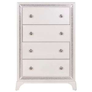 The Cassie 5-Drawer Chest brings ultra-glam style with its shimmering pearl finish and crystal in-laid hardware. Offering ample storage space, its elegant design is complemented by a crystal-inlaid border that illuminates at the flip of a switch, adding a touch of enchantment to any room. Glamorous and functional, this chest elevates both style and practicality in your space.