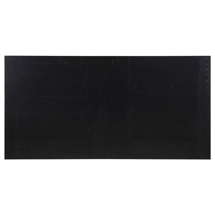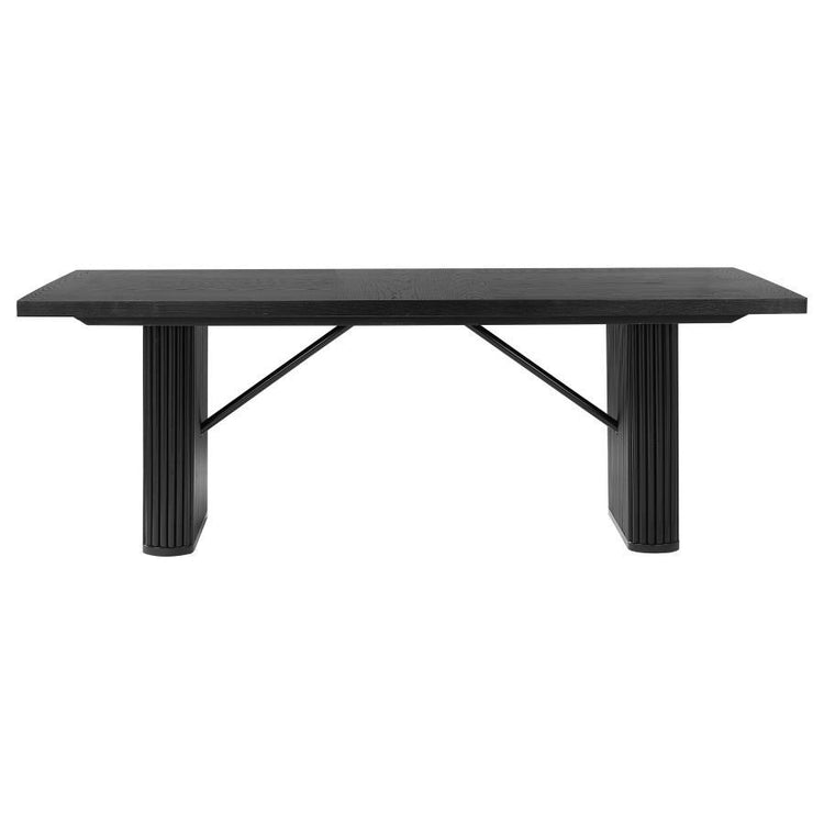 Make a bold statement with this stunning dining table. Its oak veneer top with a sleek black finish exudes elegance and modernity. The tambour base design steals the show with its captivating fluted patterns, showcased on the double pedestal legs. Embrace the perfect blend of style and functionality, as this table becomes the centerpiece of your dining space.