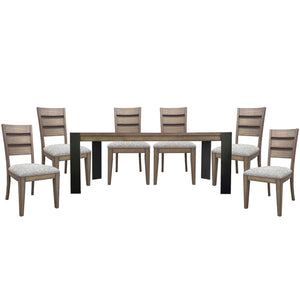 Casual and comfortable, this dining group from the Cedar Fork collection embodies transitional design. The set features a 78" Rectangle Leg Table and six of our coordinating Upholstered Seat Ladderback Dining Chairs in a smooth Smoked Arabica finish.