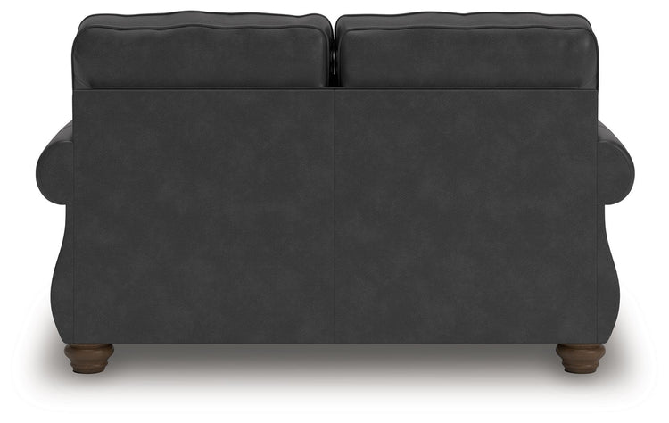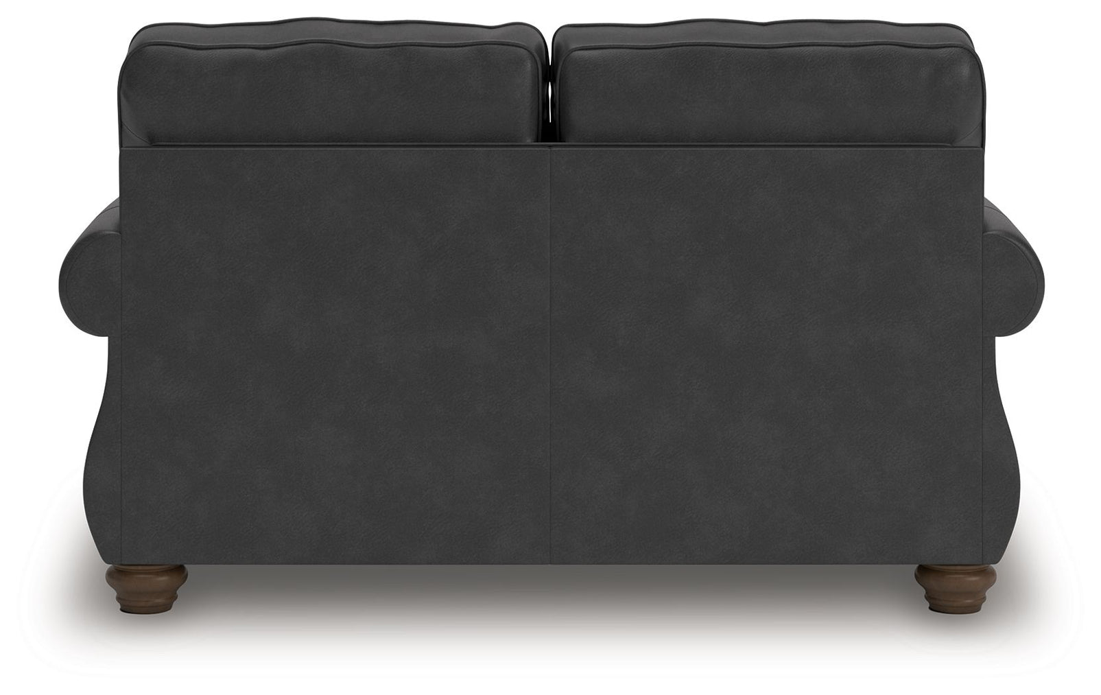 Everyone can have the best seat in the house with this loveseat. Its nailhead trim puts the finishing touches on the traditional roll arms you love. Comfy, durable cushions—wrapped in a rustic yet sophisticated faux leather—keep you feeling relaxed. Chenille pillows in a distressed motif pattern add another layer of comfort. And the loveseat's turned legs show that style and quality flow from top to bottom.