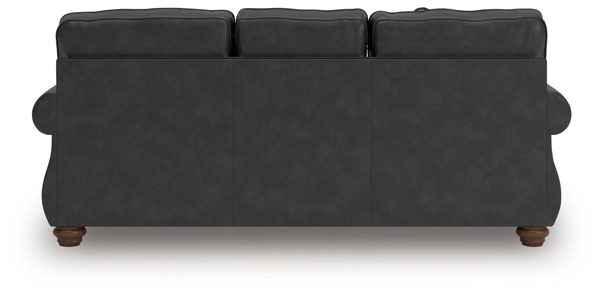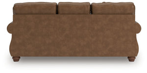 Everyone can have the best seat in the house with this sofa. Its nailhead trim puts the finishing touches on the traditional roll arms you love. Comfy, durable cushions—wrapped in a rustic yet sophisticated faux leather—keep you feeling relaxed. Chenille pillows in a distressed motif pattern add another layer of comfort. And the sofa's turned legs show that style and quality flow from top to bottom.