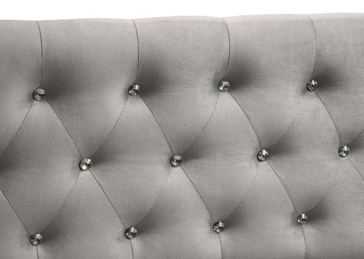 Enjoy sophisticated elegance with this wood daybed for a guest bedroom. It is expertly crafted with Asian hardwood, poplar, plywood, and MDF and is mattress-ready (no box spring required). Bed is highlighted by exquisite faux crystal rhinestone button tufted back with curved track arm design. Also includes built-in trundle. Wrapped in soft, opulent grey velvet upholstery that's simply breathtaking.