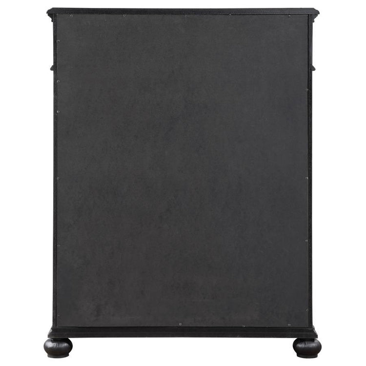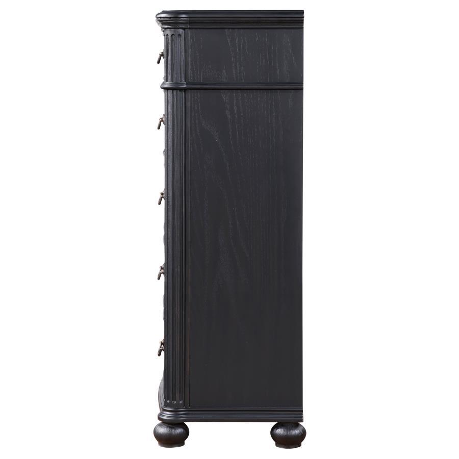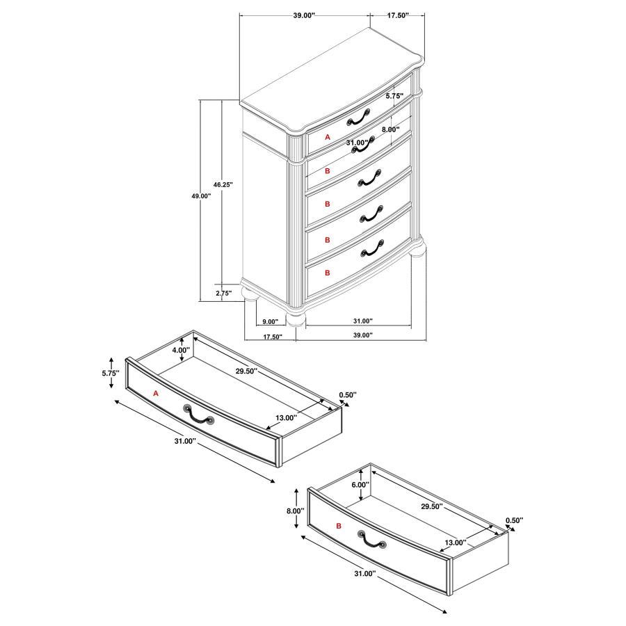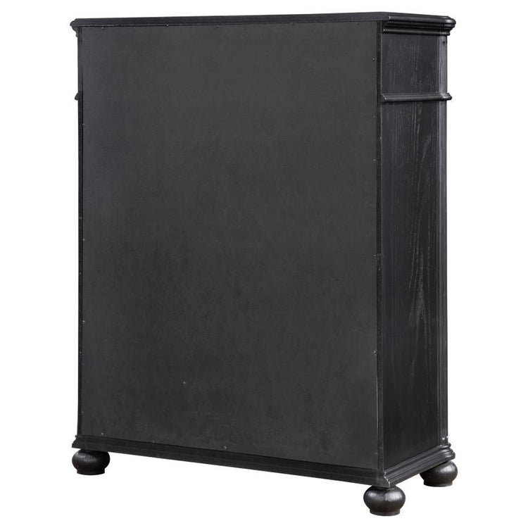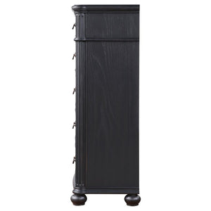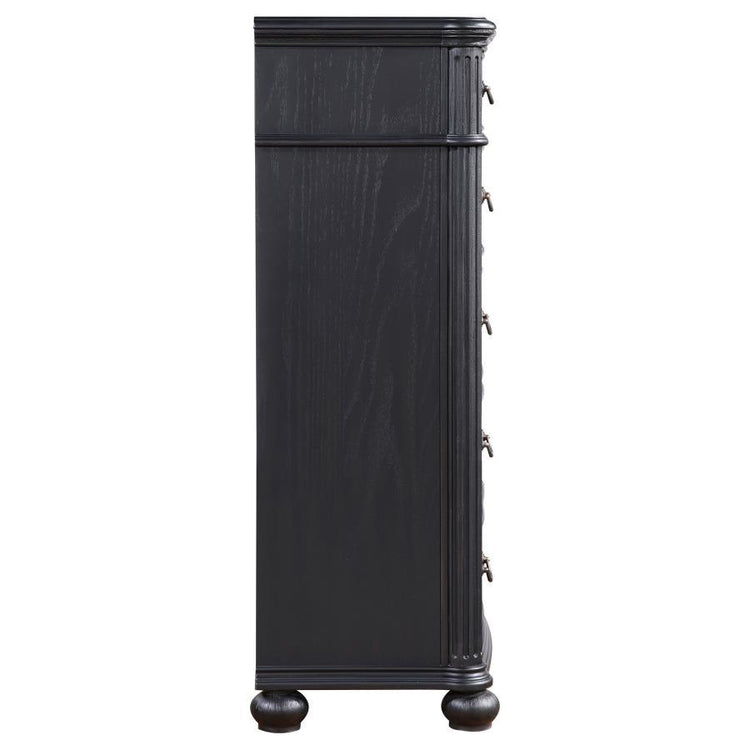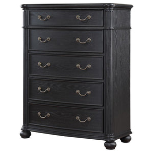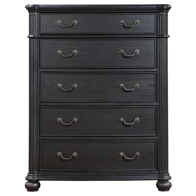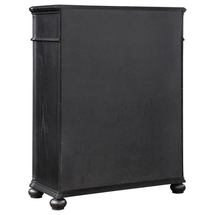 This five-drawer chest is a testament to refined bedroom storage, with its towering design and thoughtful features. The top drawer, felt-lined for protection, is an ideal space for keeping valuables and sensitive items. The classic dark finish and detailed hardware lend themselves to a design that's both functional and aesthetically pleasing, meeting your storage needs with elegance and grace.
