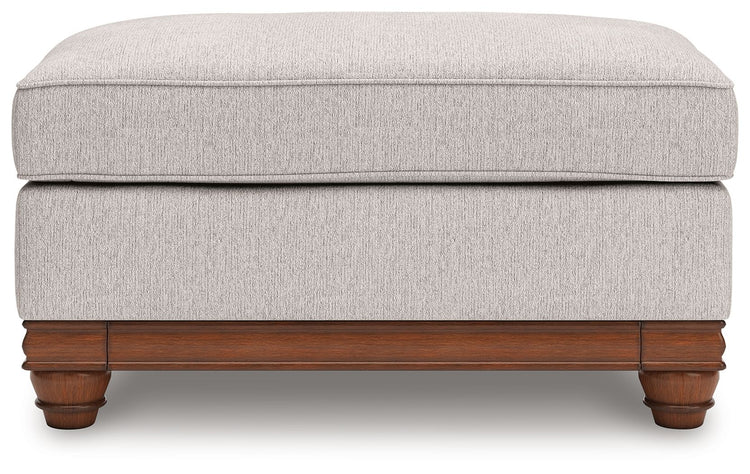 Fresh yet classic. That’s the beauty of this ottoman. Dressy and also soft to the touch, its organic neutral-toned upholstery is sure to bring a transitional farmhouse aesthetic to your living space. A full wraparound base and decorative legs complete the timeless look. It's the perfect place to kick up your feet at the end of a long day.