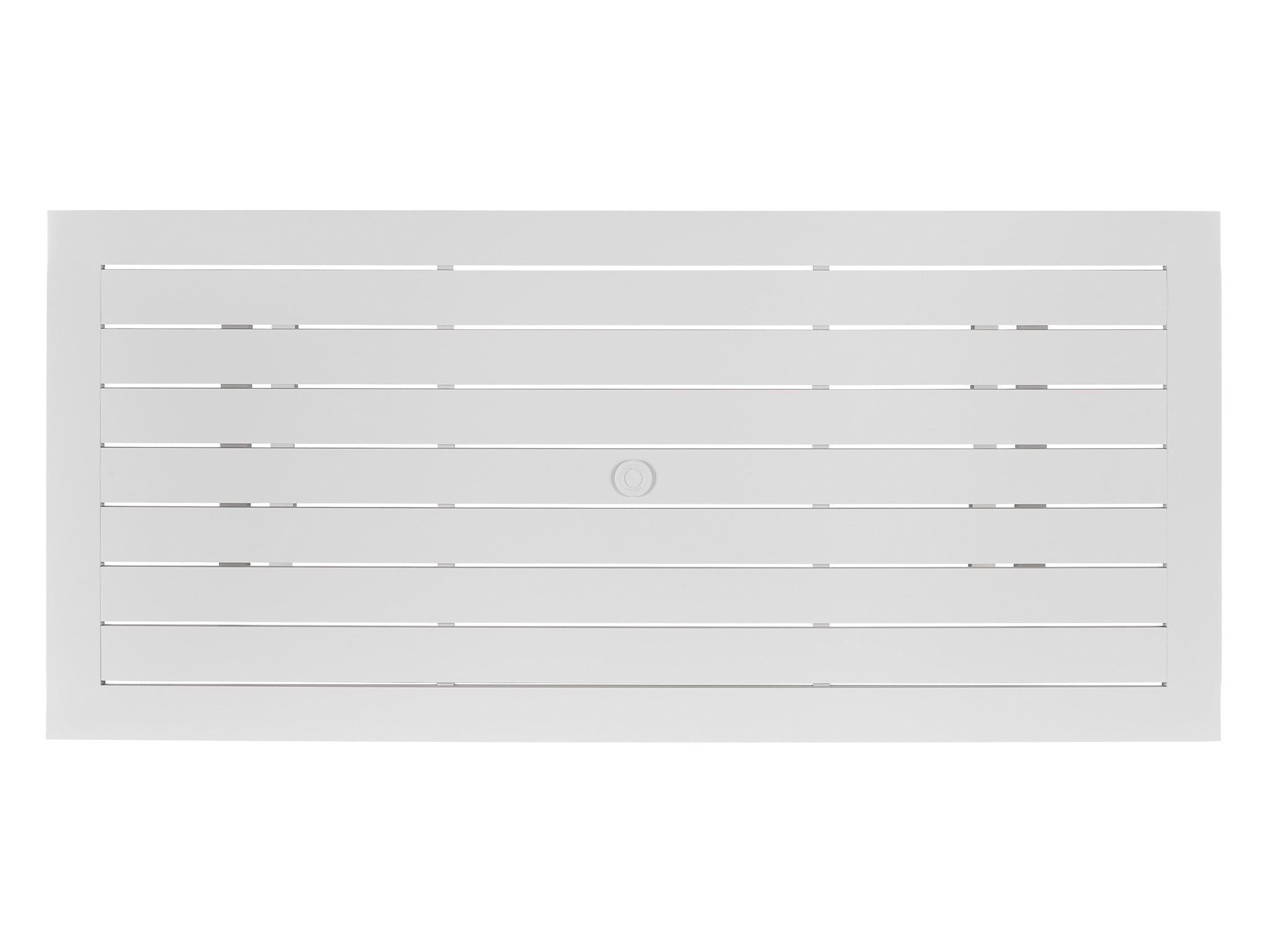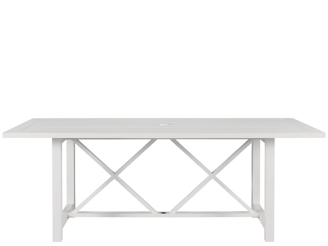 Enrich outdoor spaces with the Tybee Dining Table, a bright white aluminum dining table featuring a series of angular accents, plus a convenient umbrella hole for added shade when needed.