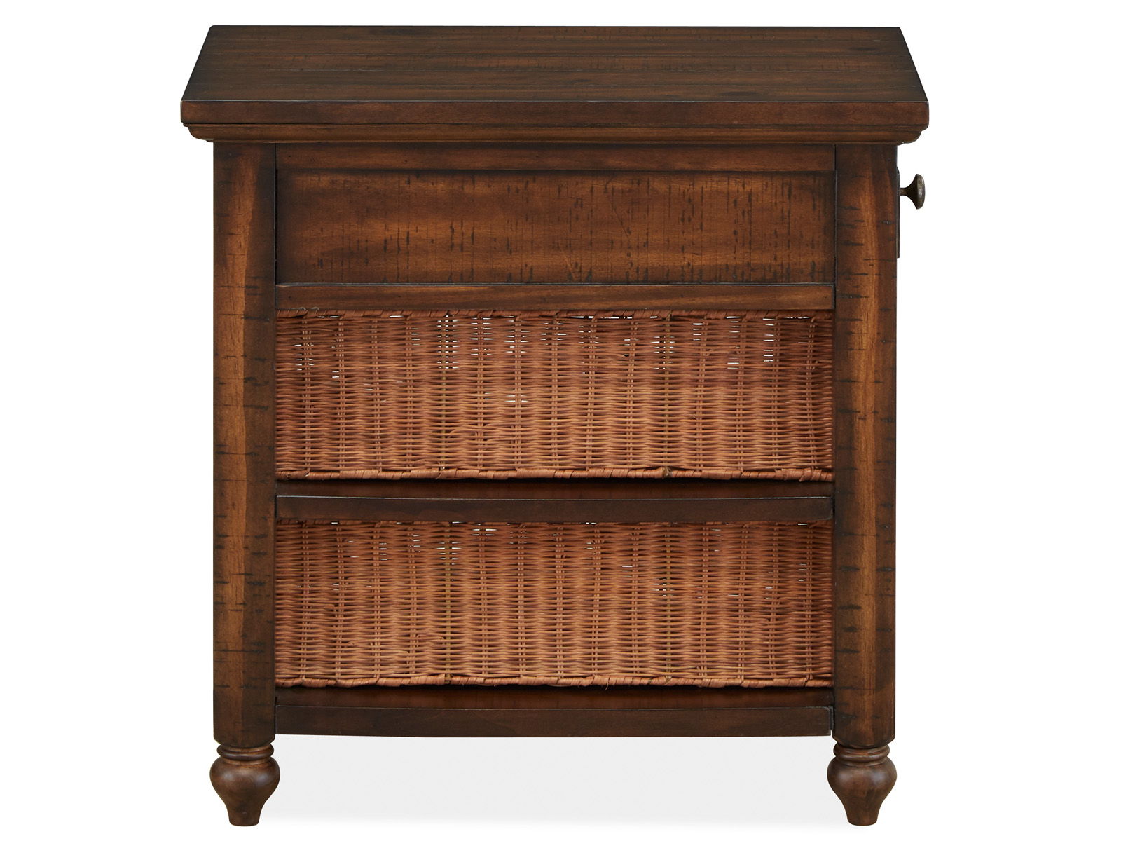 Put your feet up and relax with bungalow style with the Cottage Lane table ensemble. The appealing mix of materials includes pine veneer and solids, rattan baskets, casters, and weathered bronze hardware. Plenty of storage and easy lifestyle appeal welcome in this 4 piece casual collection.