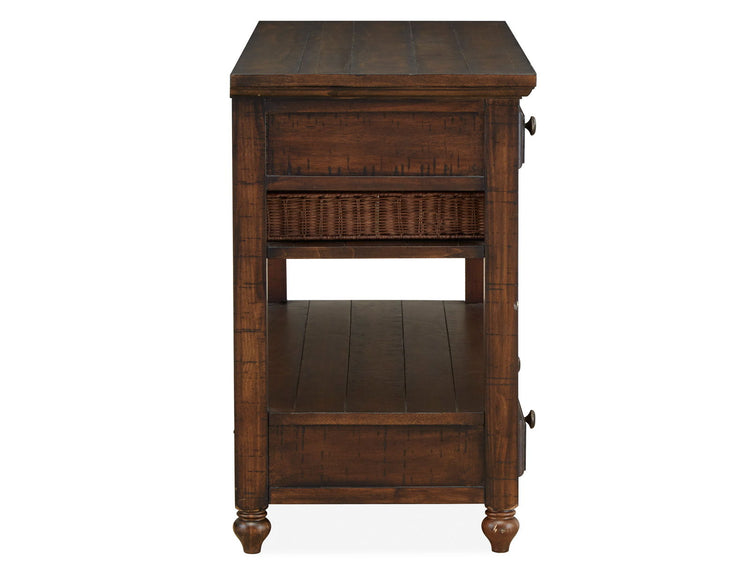 Put your feet up and relax with bungalow style with the Cottage Lane table ensemble. The appealing mix of materials includes pine veneer and solids, rattan baskets, casters, and weathered bronze hardware. Plenty of storage and easy lifestyle appeal welcome in this 4 piece casual collection.