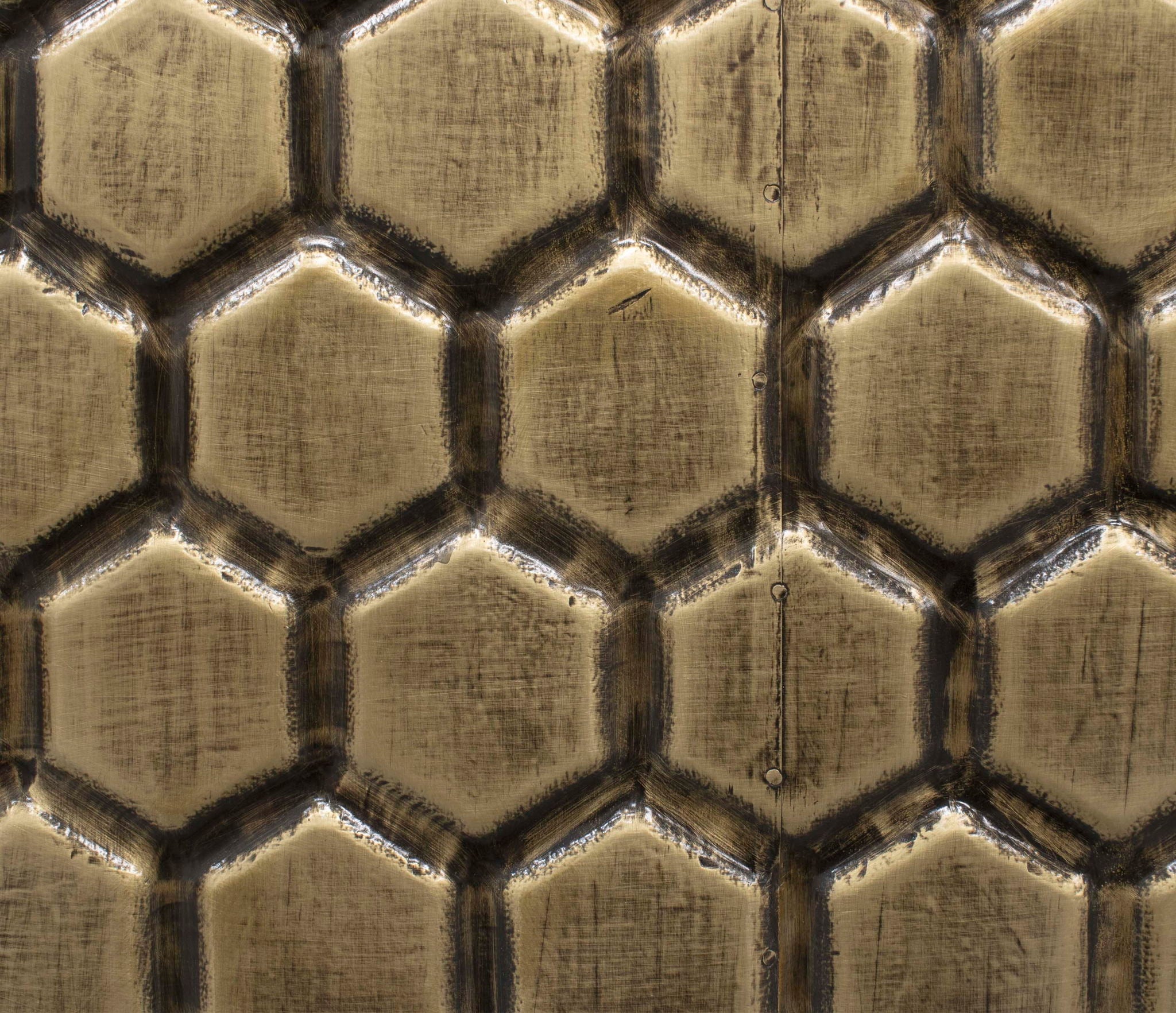 - Console doors are distinguished by and embossed hexagon motif in a warm bronze finish