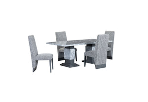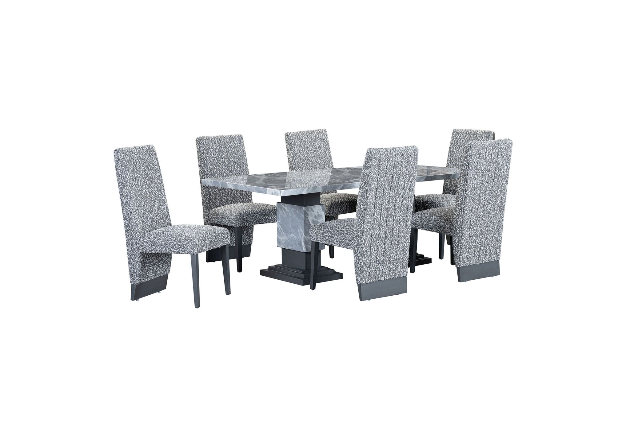 Introducing the D1212 Dining Set by Global Furniture, a stunning and contemporary addition to your dining space. This exquisite set combines elegance and durability, perfect for both casual family meals and sophisticated dinner parties. The focal point of this set is the table, featuring a faux marble top that exudes timeless luxury. Its sleek grey base with faux marble accents adds a touch of modernity and complements any interior decor effortlessly. Crafted with meticulous attention to detail, the D1212 table offers a sturdy construction that ensures years of reliable use. The 8 accompanying chairs are designed to provide both comfort and style. Upholstered in plush grey and white fabric, they offer a luxurious seating experience. The chairs' standout feature is the Chanel tufting on their backs, which adds a touch of sophistication and creates an eye-catching focal point. Whether you're hosting a formal dinner or enjoying a casual family gathering, the D1212 Dining Set by Global Furniture is the epitome of refined taste. Elevate your dining area with this exquisite ensemble that seamlessly combines modern aesthetics, durability, and comfort.
