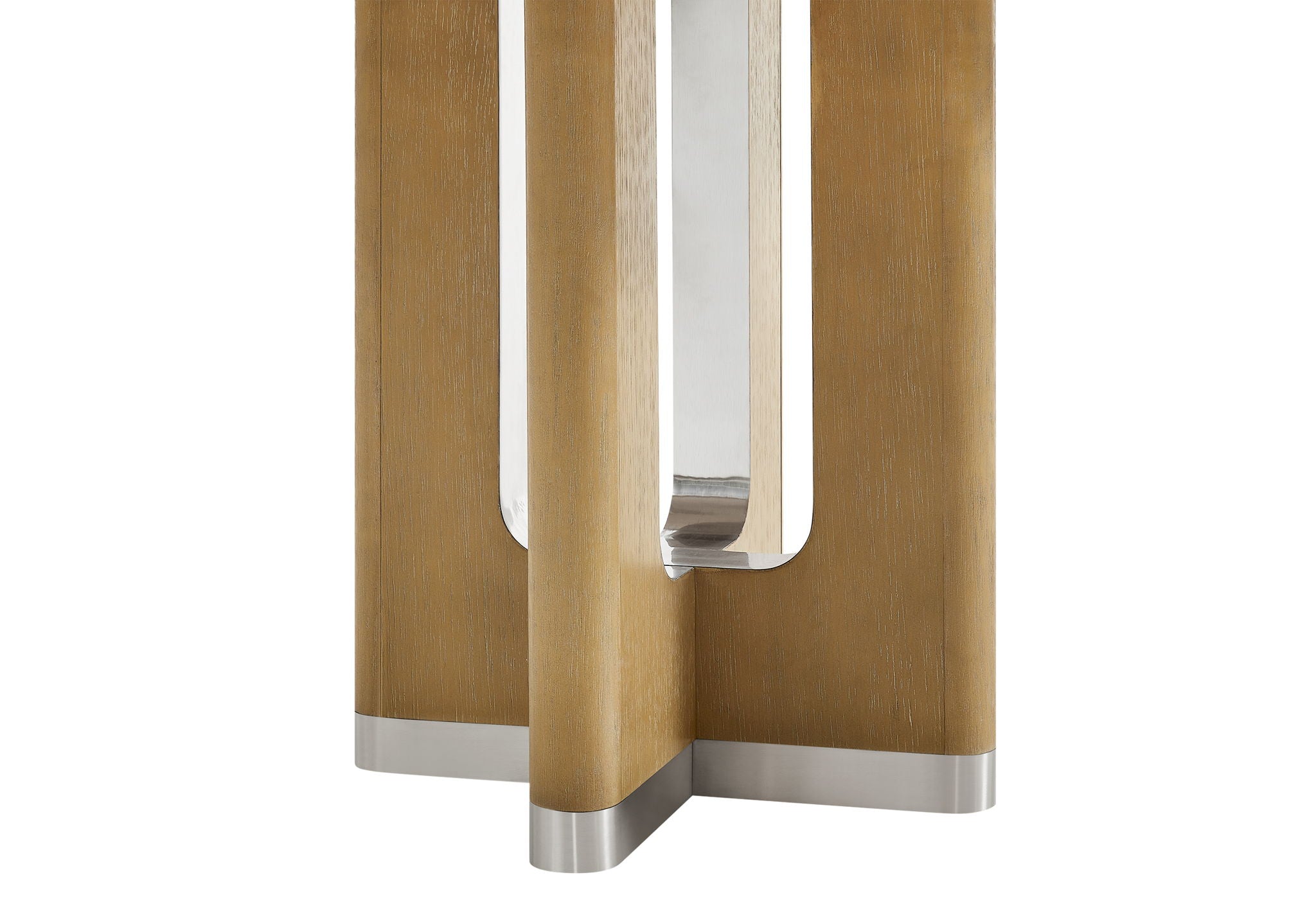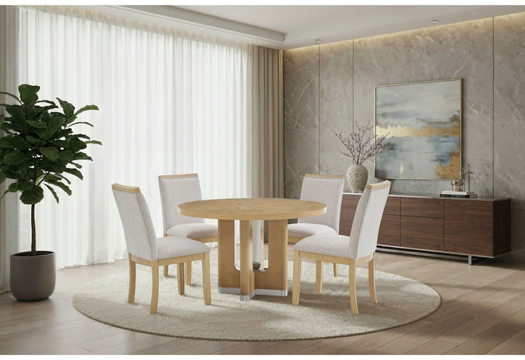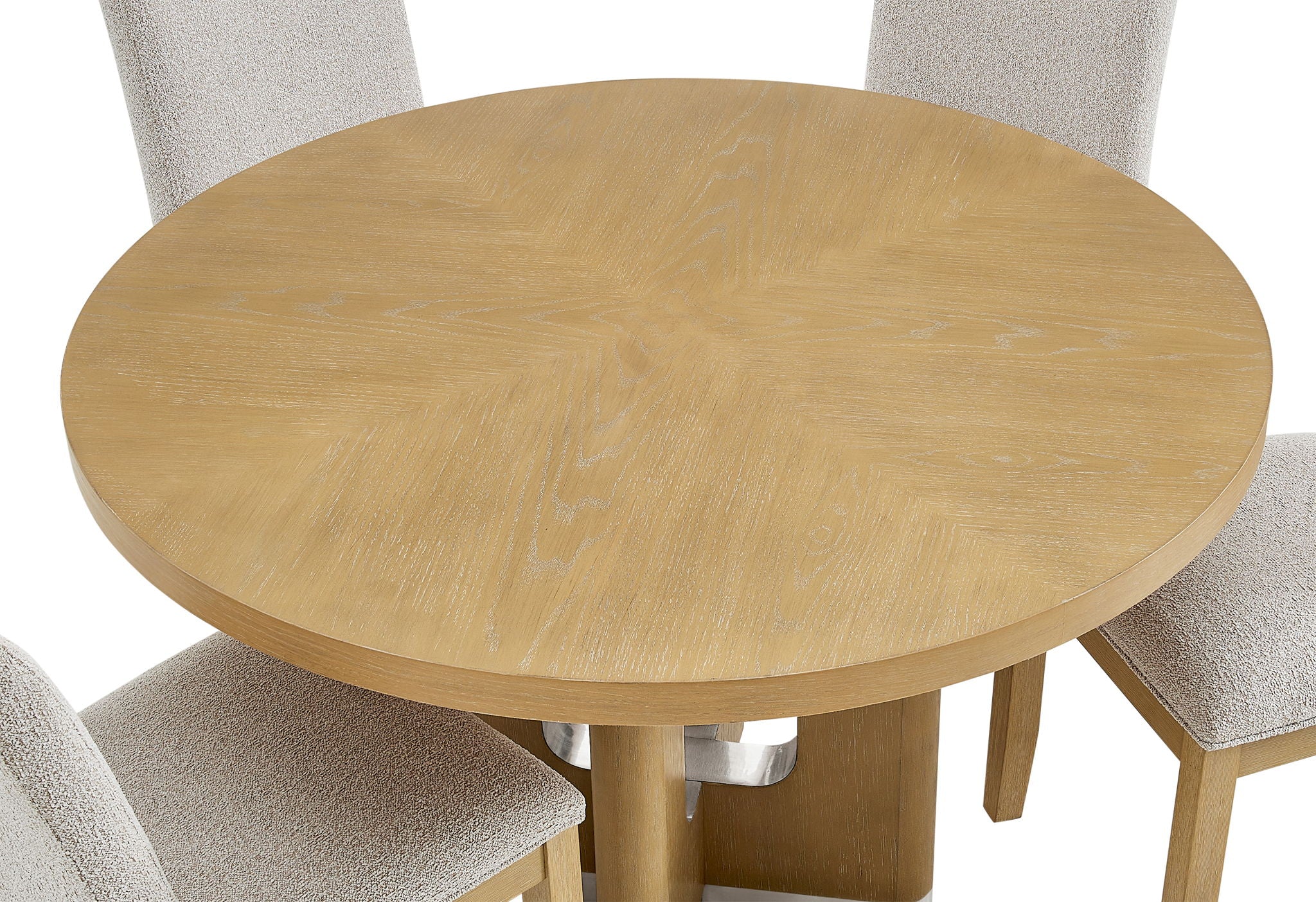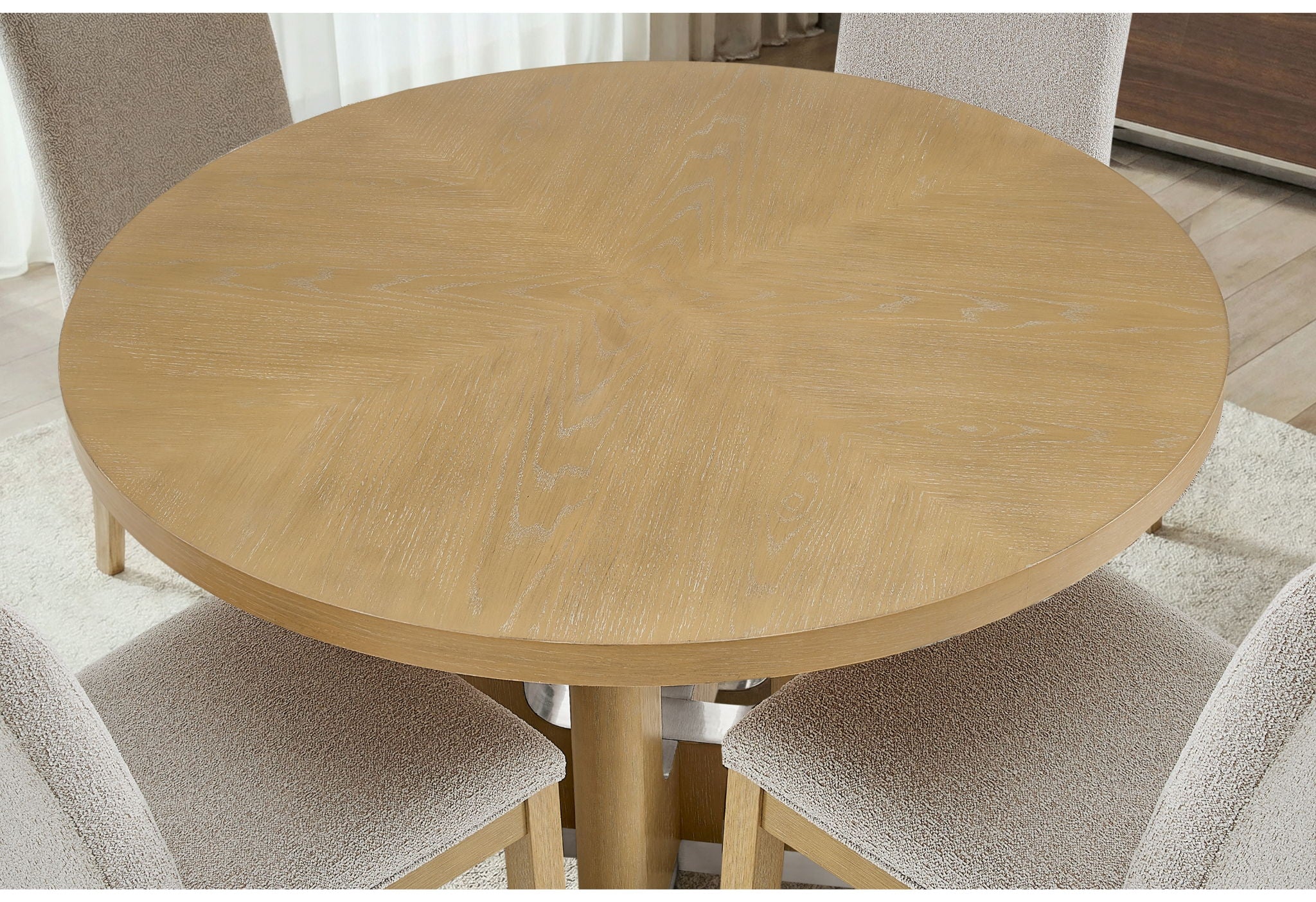 The D3124 dining set by Global Furniture USA brings effortless style and warm modern design to your dining space. The round dining table showcases a natural wood finish with a chevron patterned tabletop and architectural base that adds visual interest and refined sophistication. Coordinating 6 upholstered dining chairs complete the look with soft neutral fabric and gently tapered legs, blending comfort and contemporary elegance. This set creates a welcoming gathering space ideal for everyday dining or entertaining guests.