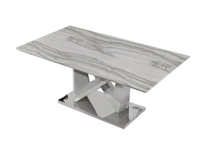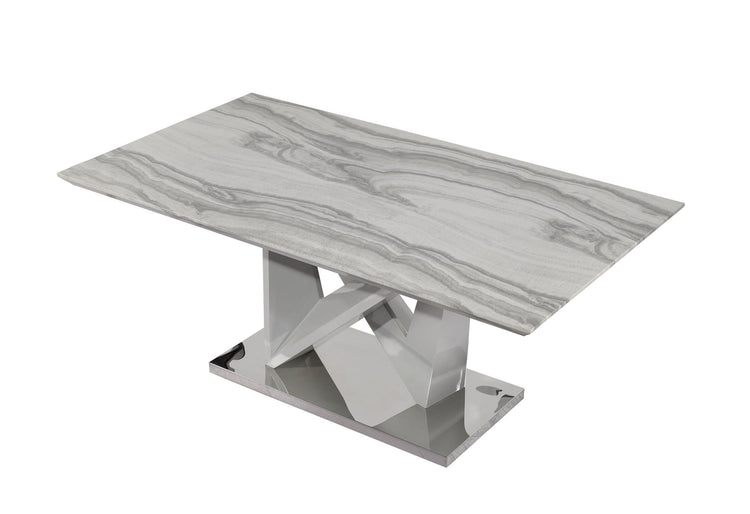 For a stylish and dramatic impression seek no further than this grey faux marble dining table. Elegant in style this ultra contemporary dining table will be the talk of your dining space. Design elements are not in short supply with this table, featuring an architectural pedestal base, stainless steel bottom plate, and a spacious top making this table a stylish and smart choice for your dining space.