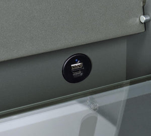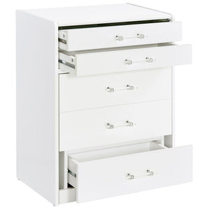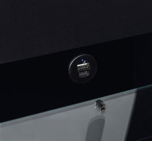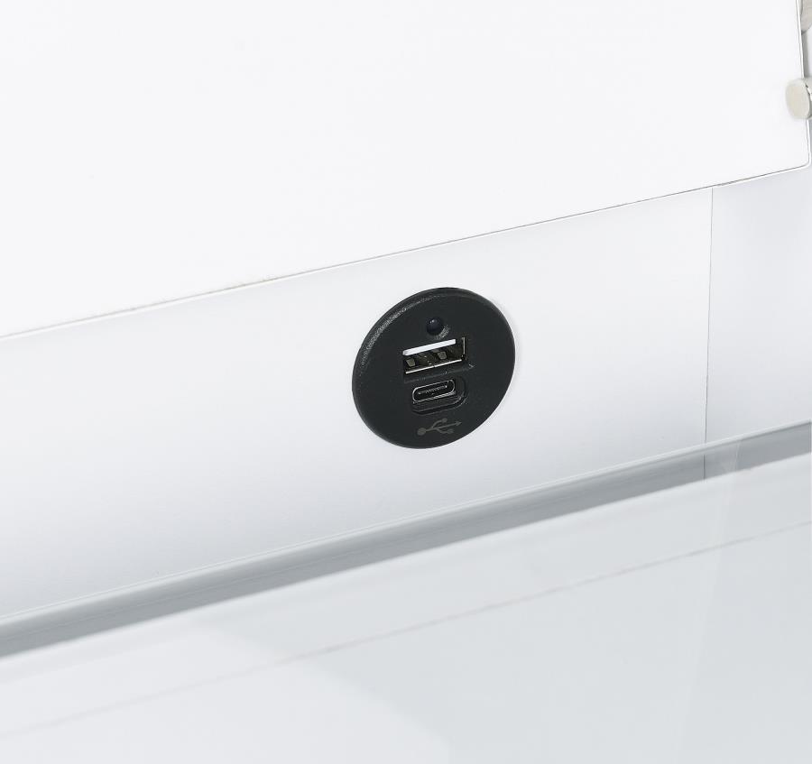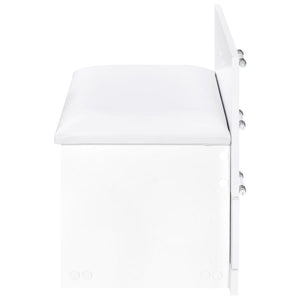 This high gloss makeup vanity set, crafted from engineered wood with eco-friendly laminate, blends seamlessly into your bedroom, doubling as a chic chest of drawers. The flip-top vanity mirror with LED lighting offers perfect illumination, while built-in dual USB outlets (Type A and Type C) allow for convenient device charging. The clear glass tabletop reveals a compartmentalized drawer for easy organization, and the cushioned vanity chair includes extra storage. Clear acrylic and chrome pull handles add a modern, elegant touch.