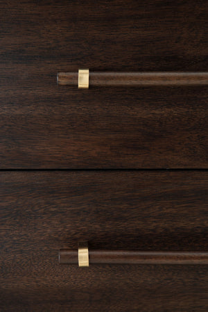 - Solid wood pulls with brass-tone metal accents